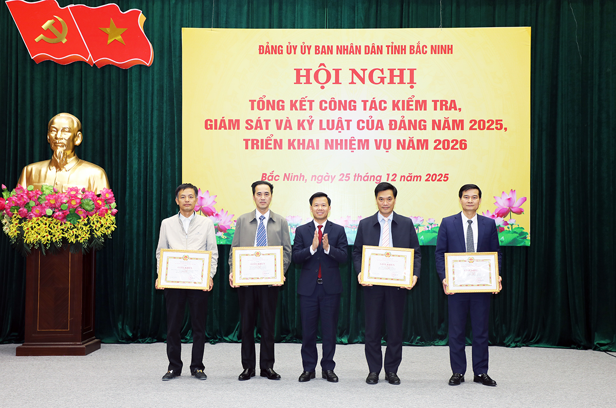 (BNP) - Chiều 25/12, Đảng ủy UBND tỉnh Bắc Ninh tổ chức Hội nghị tổng kết công tác lãnh đạo, tổ chức thực hiện nhiệm vụ kiểm tra, giám sát và thi hành kỷ luật Đảng năm 2025; triển khai phương hướng, nhiệm vụ năm 2026. Đồng chí Bùi Công Vĩ, Phó Bí thư Đảng ủy, Chủ nhiệm Ủy ban Kiểm tra Đảng ủy UBND tỉnh dự, chủ trì Hội nghị.