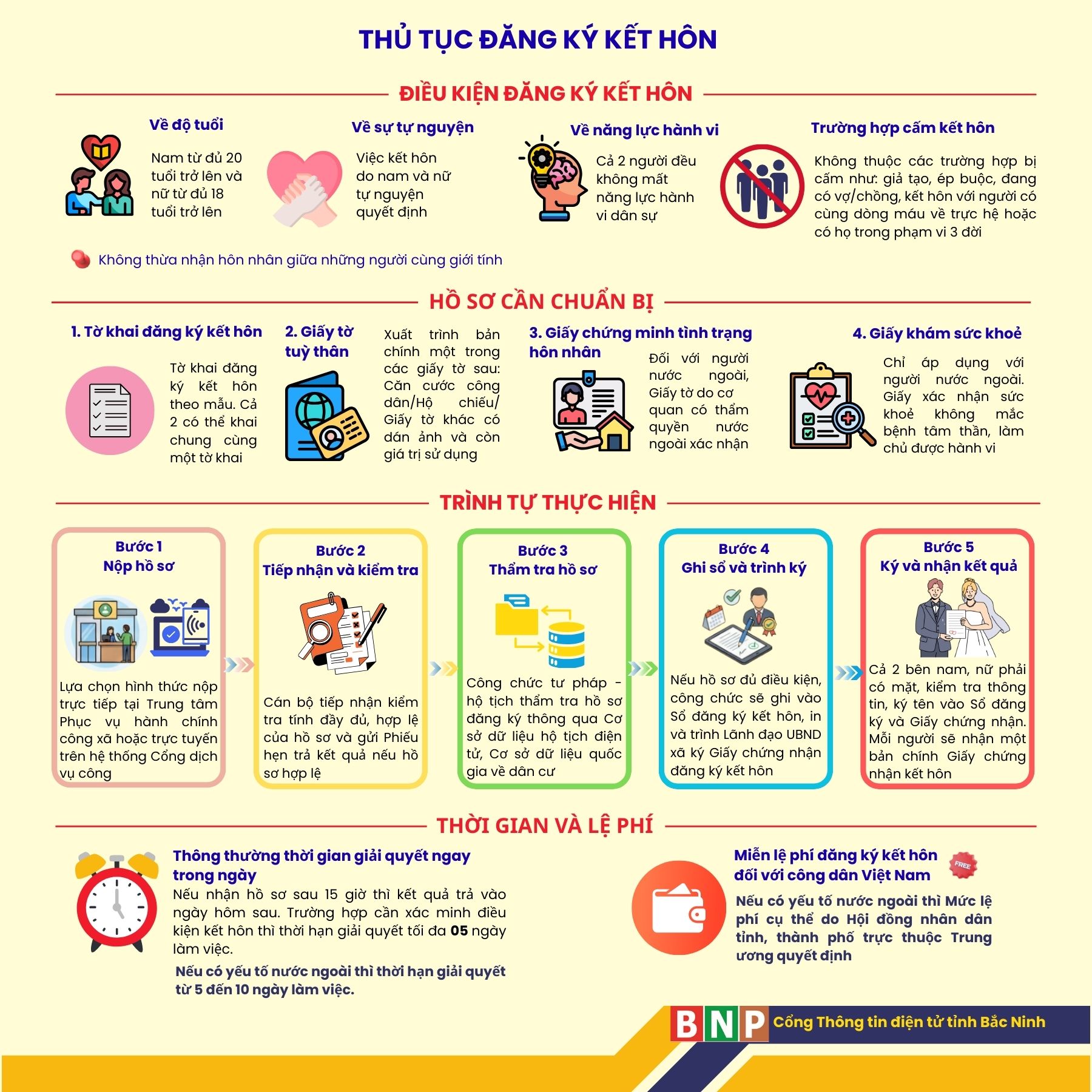 (BNP) - Bộ Tư pháp vừa ban hành Quyết định 3673/QĐ-BTP về việc công bố thủ tục hành chính được sửa đổi, bổ sung trong lĩnh vực hộ tịch thực hiện tại cơ quan đăng ký hộ tịch trong nước thuộc phạm vi chức năng quản lý của Bộ Tư pháp. Cổng Thông tin điện tử tỉnh Bắc Ninh giới thiệu thủ tục Đăng ký kết hôn để tạo điều kiện thuận lợi cho công dân trong việc tra cứu, tìm hiểu và thực hiện theo quy định.