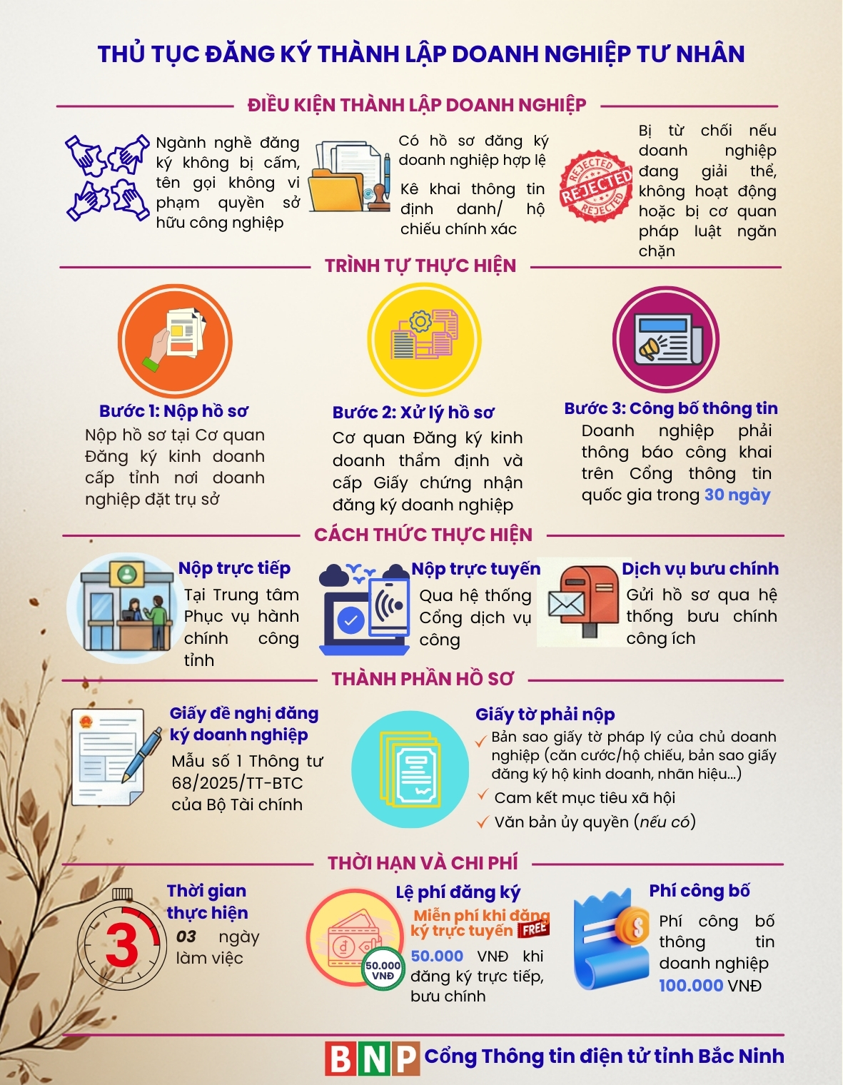 (BNP) - Bộ Tài chính vừa ban hành Quyết định 2354/QĐ-BTC về việc công bố thủ tục hành chính được sửa đổi, bổ sung, bị bãi bỏ trong lĩnh vực thành lập và hoạt động của doanh nghiệp thuộc phạm vi chức năng quản lý của Bộ Tài chính. Cổng Thông tin điện tử tỉnh Bắc Ninh giới thiệu tổng quan thủ tục Đăng ký thành lập doanh nghiệp tư nhân để tạo điều kiện thuận lợi cho người dân trong việc tra cứu, tìm hiểu và thực hiện theo quy định.