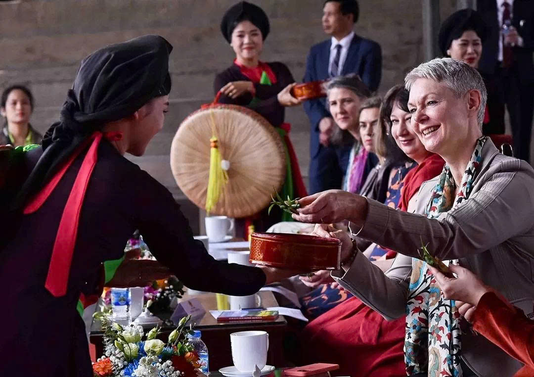 Liền chị mời trầu các nữ đại sứ và trưởng cơ quan đại diện nước ngoài tại Việt Nam thưởng thức chương trình dân ca quan họ Bắc Ninh. (Ảnh: Nguyễn Hồng)