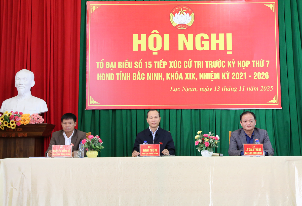 (BNP) - Chuẩn bị cho Kỳ họp thứ 7, HĐND tỉnh khóa XIX, nhiệm kỳ 2021 - 2026, sáng 13/11, tại trụ sở UBND xã Lục Ngạn, đồng chí Mai Sơn, Ủy viên Ban Thường vụ Tỉnh ủy, Phó Chủ tịch Thường trực UBND tỉnh cùng các đại biểu HĐND tỉnh Bắc Ninh thuộc Tổ đại biểu số 15 có buổi tiếp xúc cử tri cụm các xã: Lục Ngạn, Biên Sơn, Đèo Gia, Sa Lý, Biển Động, Sơn Hải, Tân Sơn.