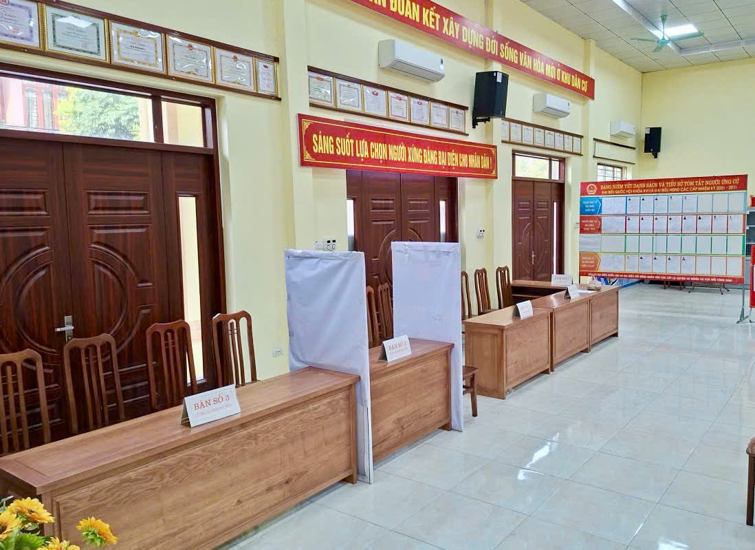 Các điểm bầu cử được trang trí pano, băng rôn và cờ Tổ quốc, sẵn sàng cho ngày hội.