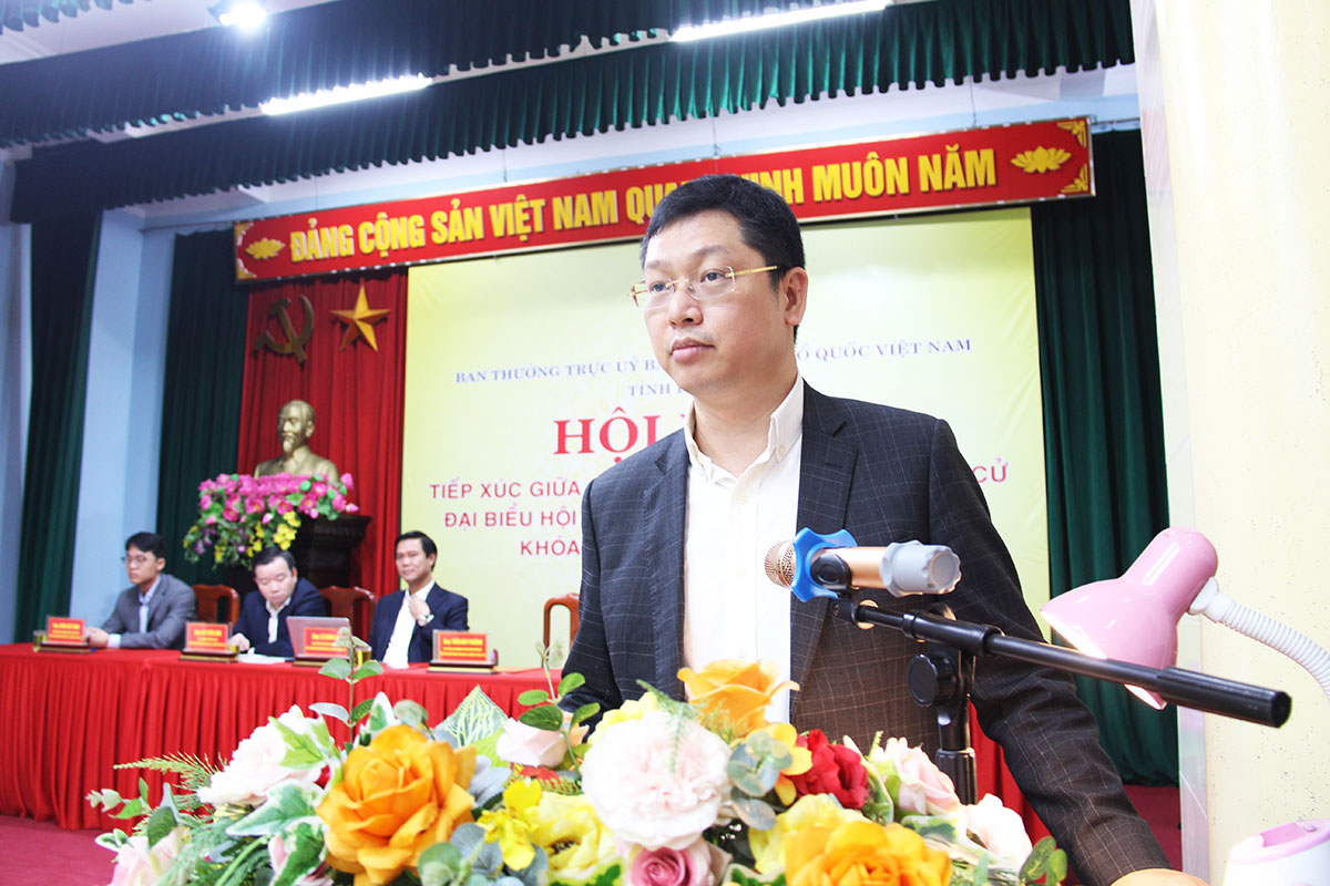 Phó Bí thư Tỉnh ủy, Chủ nhiệm Ủy ban Kiểm tra Tỉnh ủy Trần Huy Phương (thứ 4 bên phải); Phó Chủ tịch UBND tỉnh Lê Xuân Lợi (thứ 3 bên trái) cùng các ứng cử viên đại biểu HĐND tỉnh khóa XX tham dự buổi tiếp xúc.