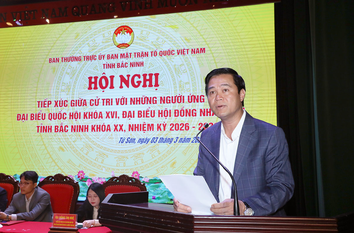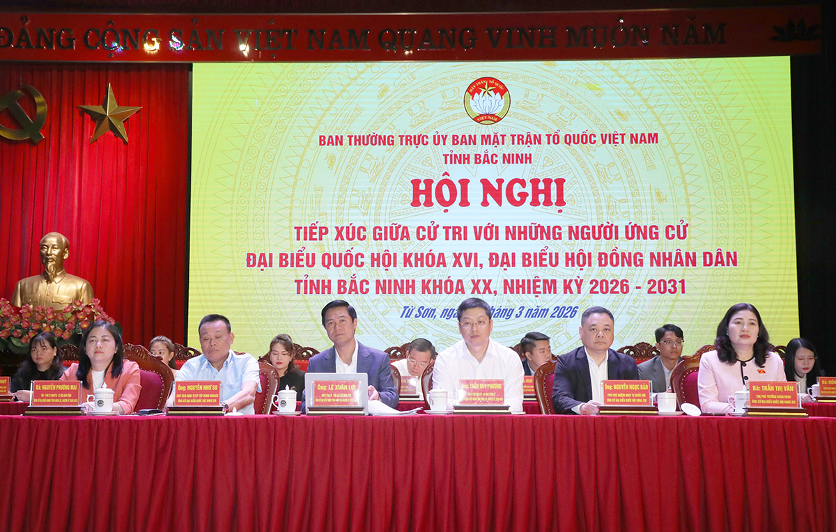 (BNP ) - Sáng 03/3, Ủy ban MTTQ Việt Nam tỉnh Bắc Ninh tổ chức Hội nghị tiếp xúc cử tri với những người ứng cử đại biểu Quốc hội (ĐBQH) khóa XVI (thuộc đơn vị bầu cử số 05) và đại biểu Hội đồng Nhân dân (HĐND) tỉnh khóa XX, nhiệm kỳ 2026 - 2031 (đơn vị bầu cử số 12) tại phường Từ Sơn và phường Phù Khê.