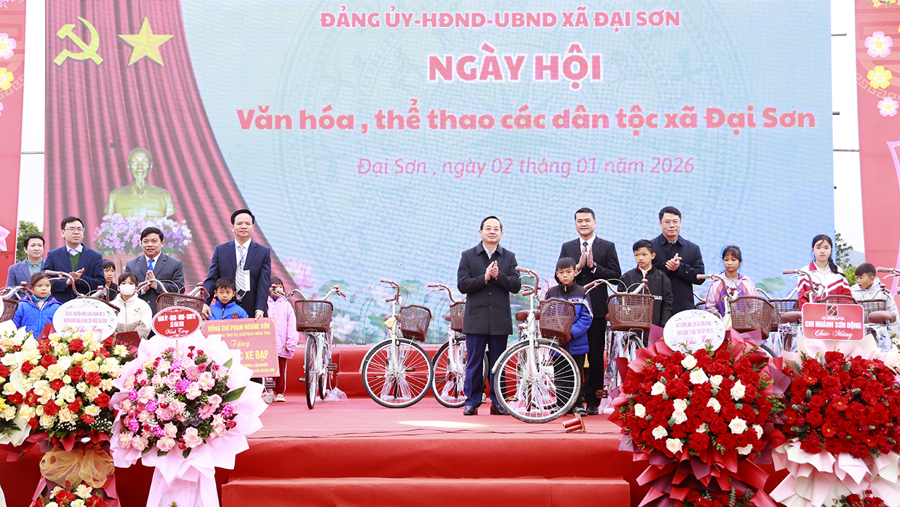 Chủ tịch UBND tỉnh Phạm Hoàng Sơn cùng các đại biểu trao tặng 30 xe đạp cho trẻ em thuộc hộ nghèo, cận nghèo có hoàn cảnh khó khăn trên địa bàn xã Đại Sơn.