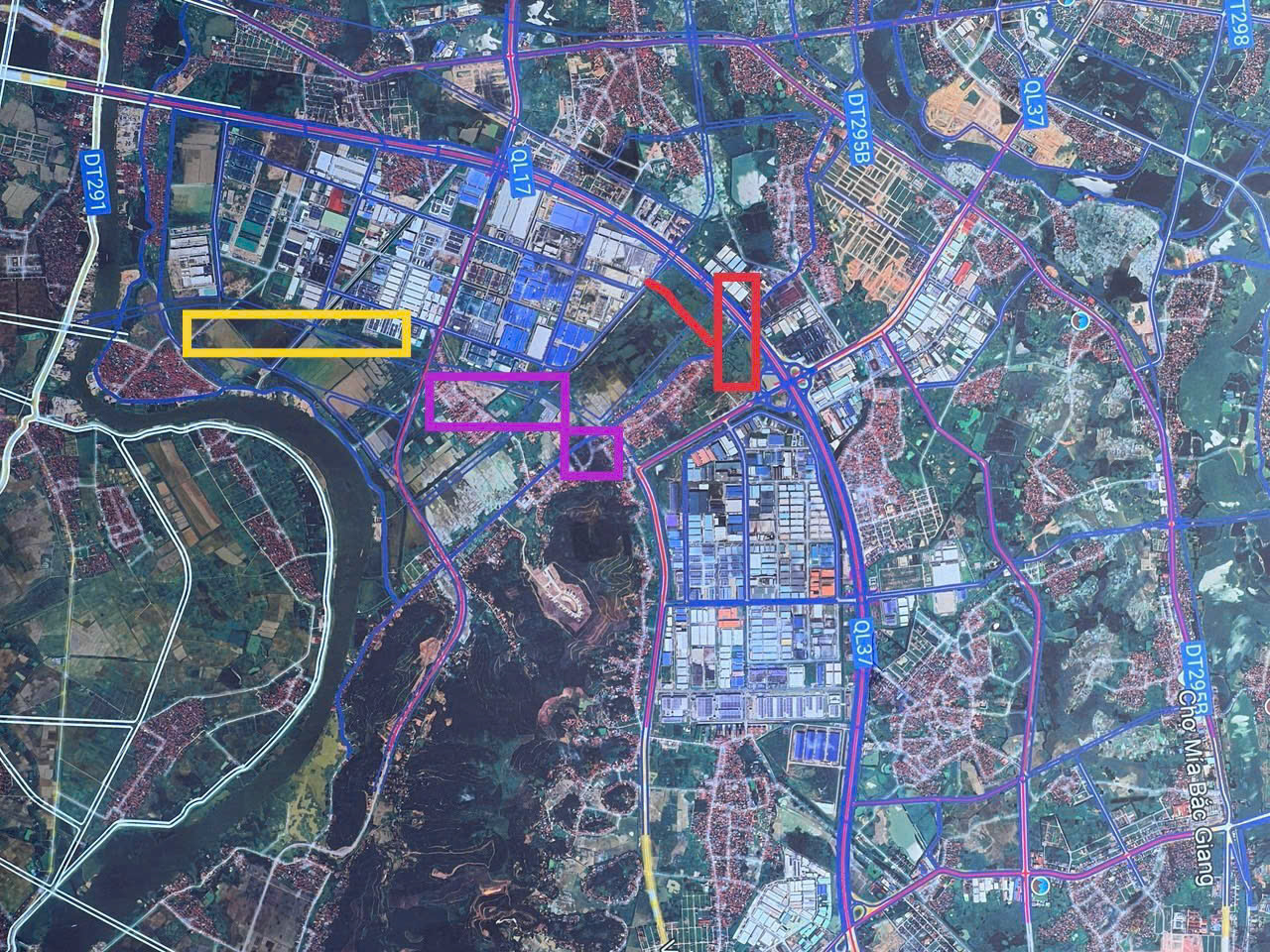 Khu vực nút giao thông ngã tư Sen hồ và Trúc Tây (ô màu tím); tuyến đường đằng sau KCN Vân Trung và KCN Quang Châu (ô màu vàng); khu cầu vượt Evergreen (ô màu đỏ).