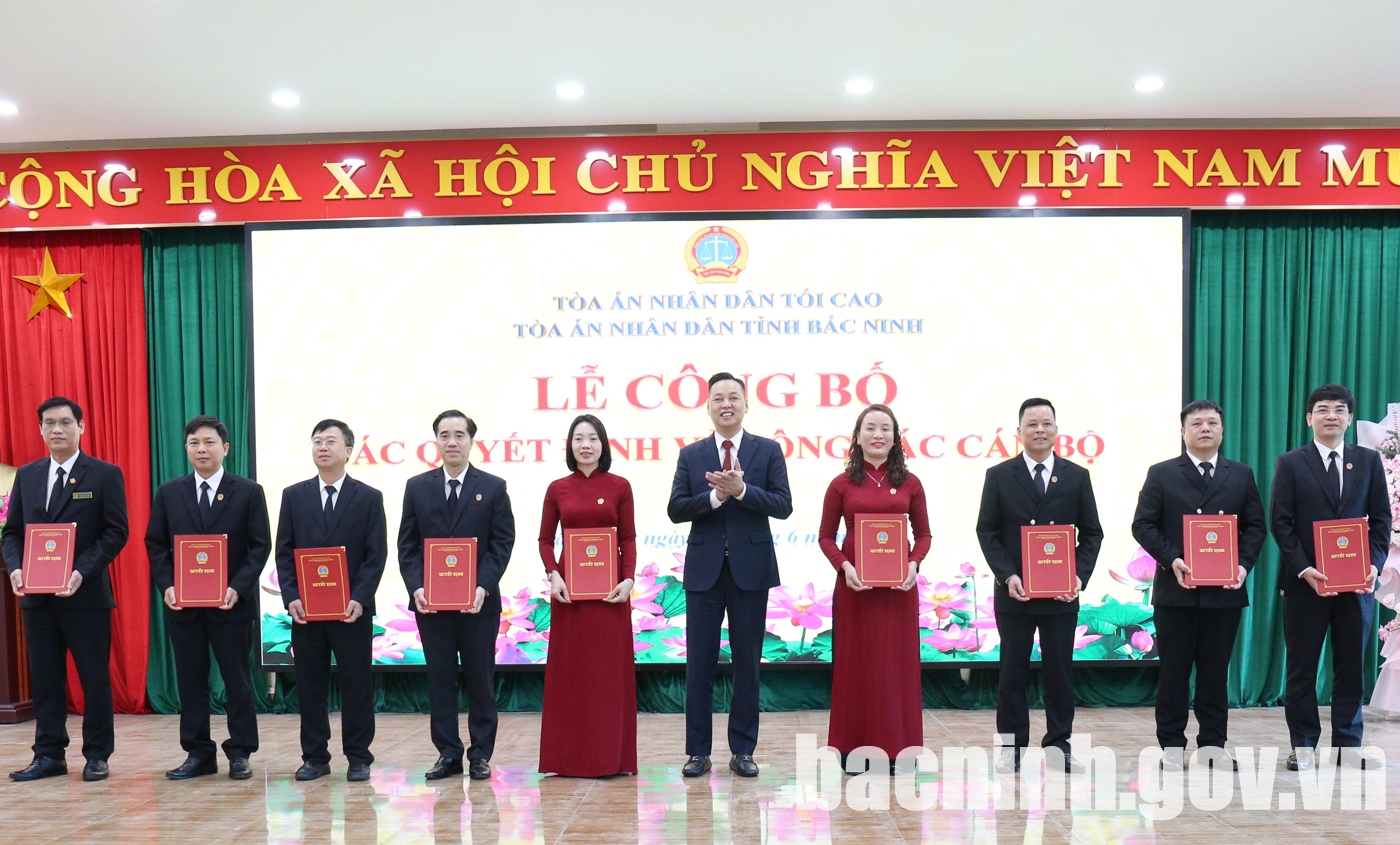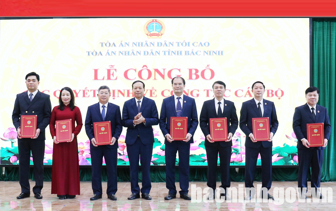 Tại buổi lễ, Ban Tổ chức công bố các Quyết định của Chánh án TAND tối cao về việc bổ nhiệm chức vụ Phó Chánh án TAND tỉnh Bắc Ninh sau hợp nhất đối với 07 đồng chí gồm: Vũ Công Đồng, Chánh án TAND tỉnh Bắc Ninh; Lương Xuân Lộc, Chánh án TAND tỉnh Bắc Giang; Hoàng Thị Thu Hiền, Nguyễn Như Hiển (Phó Chánh án TAND tỉnh Bắc Giang); Nguyễn Trọng Trường, Nguyễn Hữu Minh, Đỗ Văn Đại (Phó Chánh án TAND tỉnh Bắc Ninh). Thời hạn bổ nhiệm 5 năm, kể từ ngày 01/7/2025.