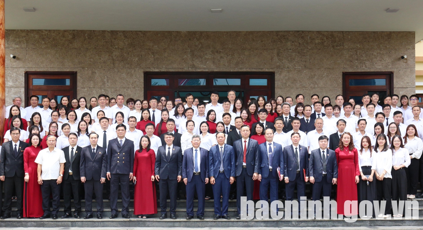 Phó Chánh án Thường trực TAND tối cao Nguyễn Trí Tuệ chụp ảnh lưu niệm cùng lãnh đạo TAND tỉnh Bắc Ninh mới và TAND các khu vực tỉnh Bắc Ninh.