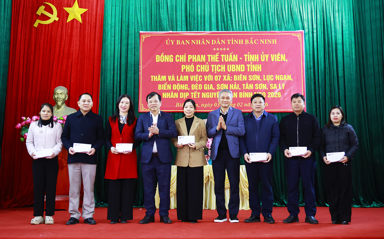 Nhân dịp Tết Nguyên đán Bính Ngọ 2026, sáng 3/2, đồng chí Phan Thế Tuấn, Phó Chủ tịch UBND tỉnh đã đến thăm, chúc Tết và tặng quà tại 7 xã: Biên Sơn, Lục Ngạn, Biển Động, Đèo Gia, Sơn Hải, Tân Sơn, Sa Lý. Cùng đi có đại diện lãnh đạo Văn phòng UBND tỉnh và Công ty Cổ phần Phát triển Fuji Bắc Giang.