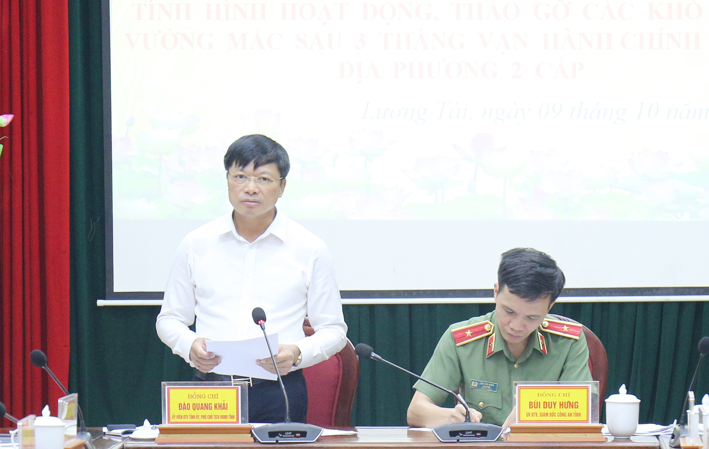 Chiều 9/10, tại trụ sở UBND xã Lương Tài, đồng chí Đào Quang Khải, Ủy viên Ban Thường vụ Tỉnh ủy, Phó Chủ tịch UBND tỉnh làm việc với 4 xã: Lương Tài, Trung Chính, Lâm Thao, Trung Kênh để nắm tình hình hoạt động, tháo gỡ các khó khăn, vướng mắc sau 3 tháng vận hành chính quyền địa phương 2 cấp. Cùng dự có đồng chí Bùi Duy Hưng, Ủy viên Ban Thường vụ Tỉnh ủy, Giám đốc Công an tỉnh; lãnh đạo một số Sở, ban, ngành liên quan.