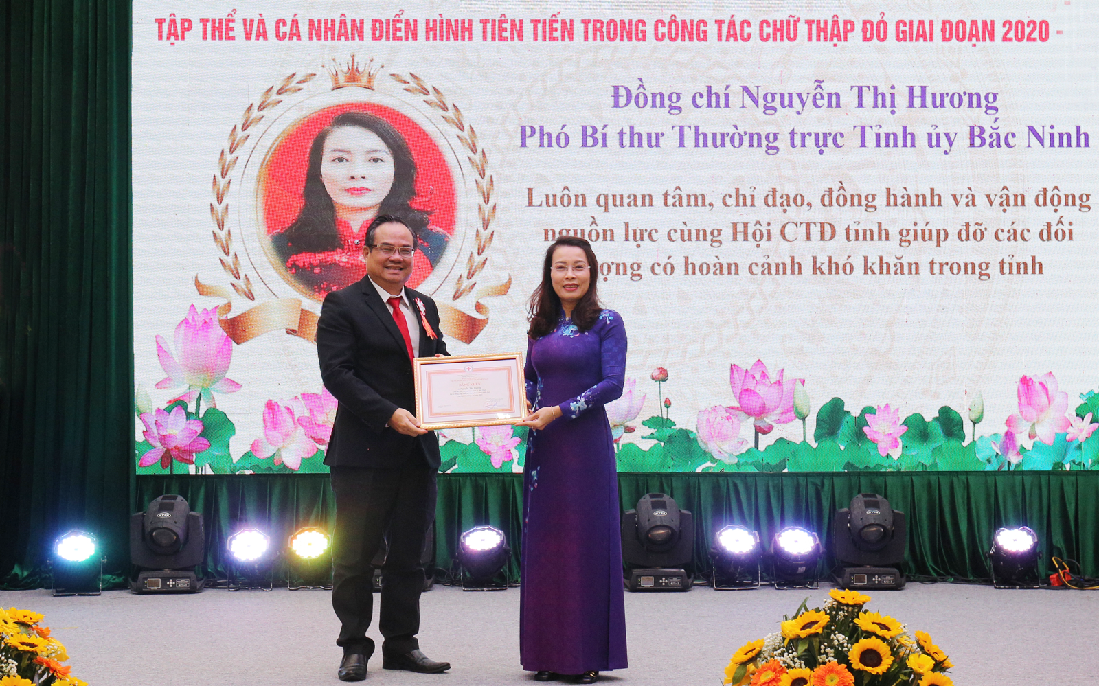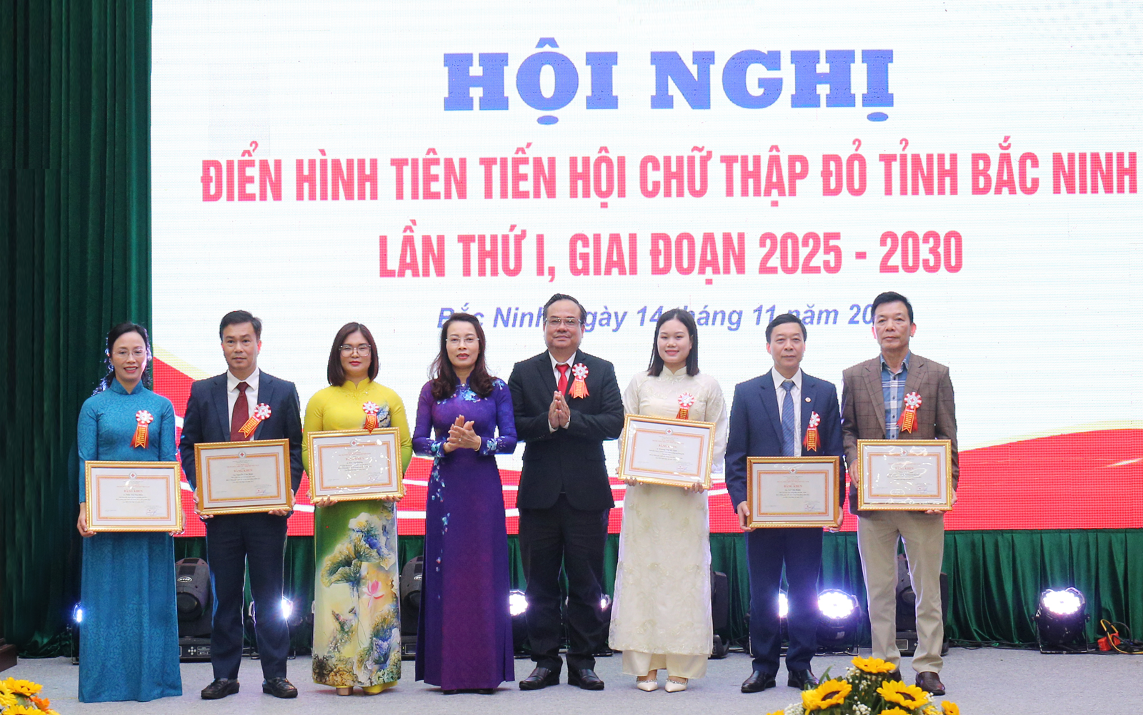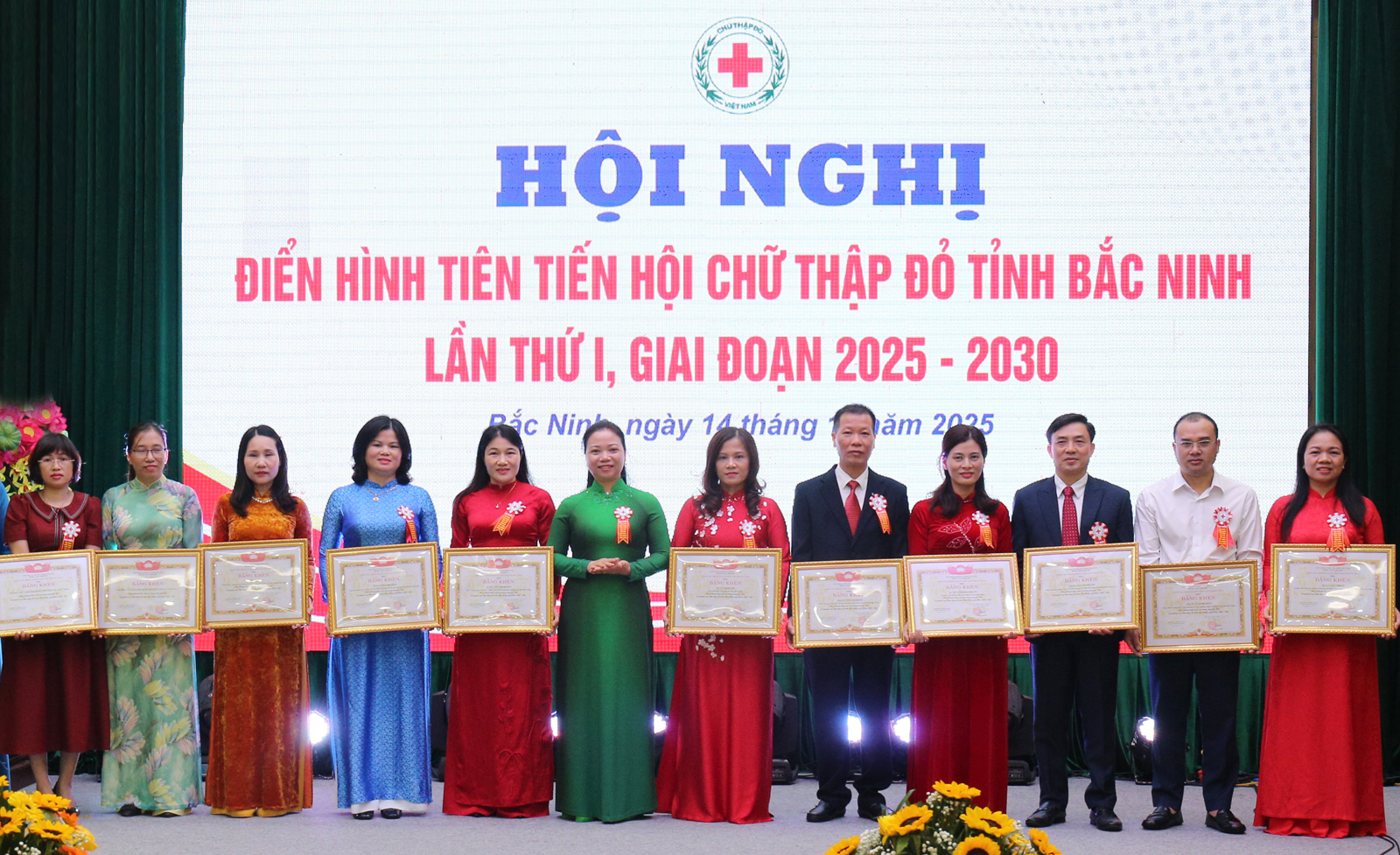 Phó Bí thư Thường trực Tỉnh ủy Nguyễn Thị Hương và Phó Chủ tịch Trung ương Hội Chữ Thập đỏ Việt Nam Vũ Thanh Lưu trao Bằng khen cho các cá nhân có thành tích xuất sắc trong công tác Hội và phong trào Chữ thập đỏ tỉnh Bắc Ninh năm 2025.