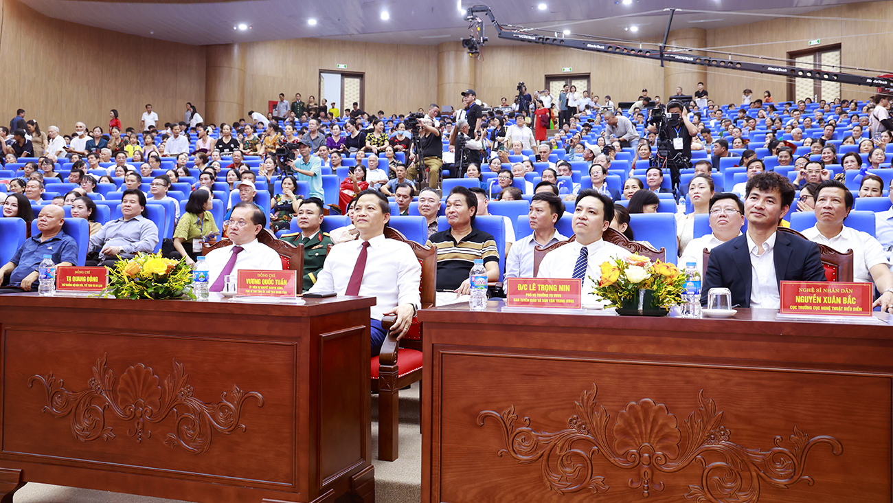 Từ phải qua: Phó Bí thư Tỉnh ủy, Chủ tịch HĐND tỉnh Nguyễn Việt Oanh; Phó Chủ tịch Thường trực HĐND tỉnh Trần Thị Hằng; Phó Chủ tịch HĐND tỉnh Lâm Thị Hương Thành; Phó Chủ tịch UBND tỉnh Lê Xuân Lợi; Trưởng Ban Tuyên giáo và Dân vận Tỉnh ủy Nguyễn Đình Lợi và các đại biểu dự Liên hoan Chèo toàn quốc năm 2025.