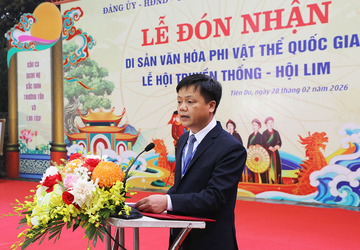 Phát biểu tại buổi lễ, Phó Chủ tịch Thường trực UBND tỉnh Mai Sơn chúc mừng Lễ hội truyền thống – Hội Lim đón nhận danh hiệu Di sản văn hóa phi vật thể Quốc gia, đặc biệt trân trọng tri ân các thế hệ nghệ nhân, những “người giữ hồn” của lễ hội - những người đã lặng lẽ, bền bỉ gìn giữ từng câu hát, từng nghi lễ, từng phong tục qua năm tháng. Đồng chí nhấn mạnh, đây không chỉ là niềm vui, niềm tự hào của Đảng bộ, chính quyền và nhân dân hai xã Tiên Du, Liên Bão, mà còn là niềm vinh dự chung của tỉnh Bắc Ninh - vùng đất Kinh Bắc ngàn năm văn hiến, nơi hội tụ và lan tỏa những giá trị văn hóa đặc sắc của dân tộc Việt Nam.