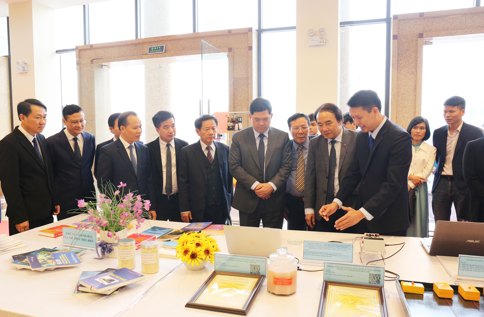 Các đồng chí lãnh đạo tham quan sản phẩm đoạt giải tại hội thi.