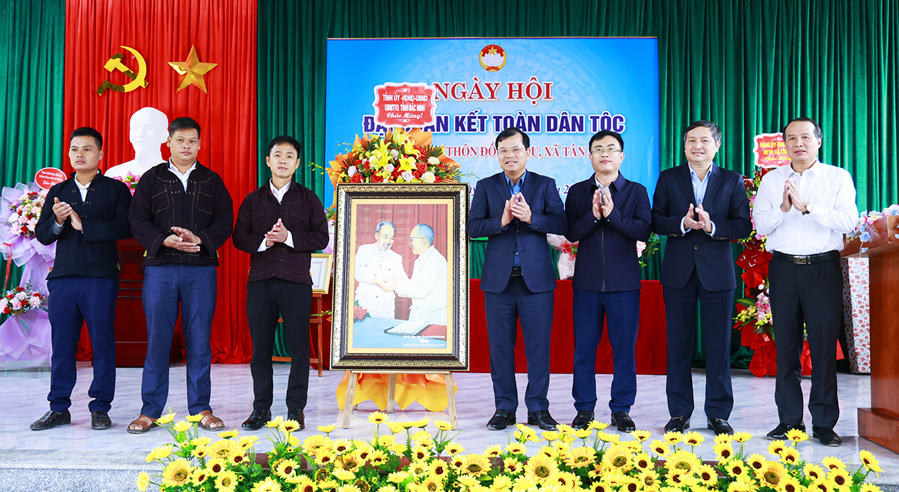 Phó Chủ tịch UBND tỉnh Phan Thế Tuấn cùng các đại biểu tặng hoa và bức tranh Bác Hồ với Bác Tôn cho lãnh đạo thôn Đồng Dau.