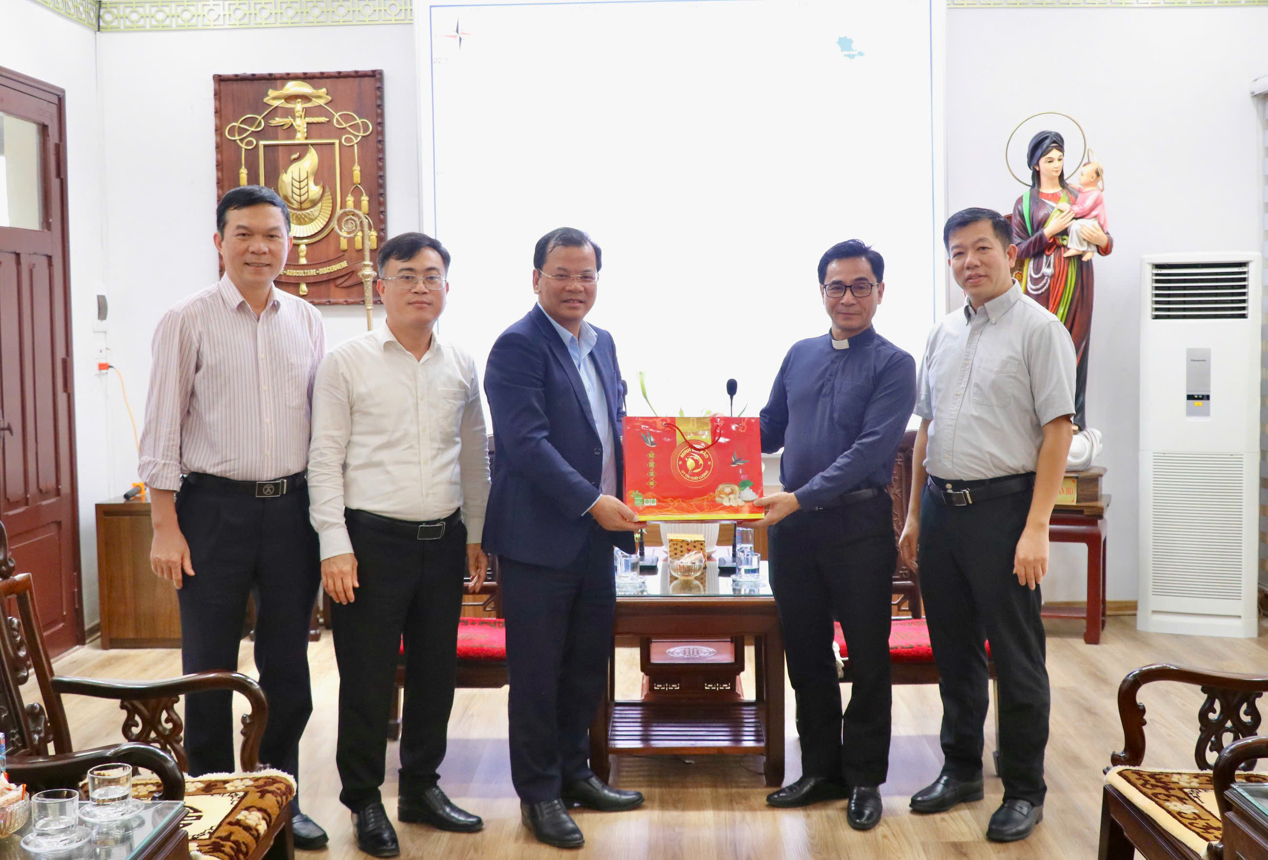 Phó Chủ tịch UBND tỉnh Phan Thế Tuấn tặng quà lưu niệm cho đại diện Tòa Giám mục Bắc Ninh.