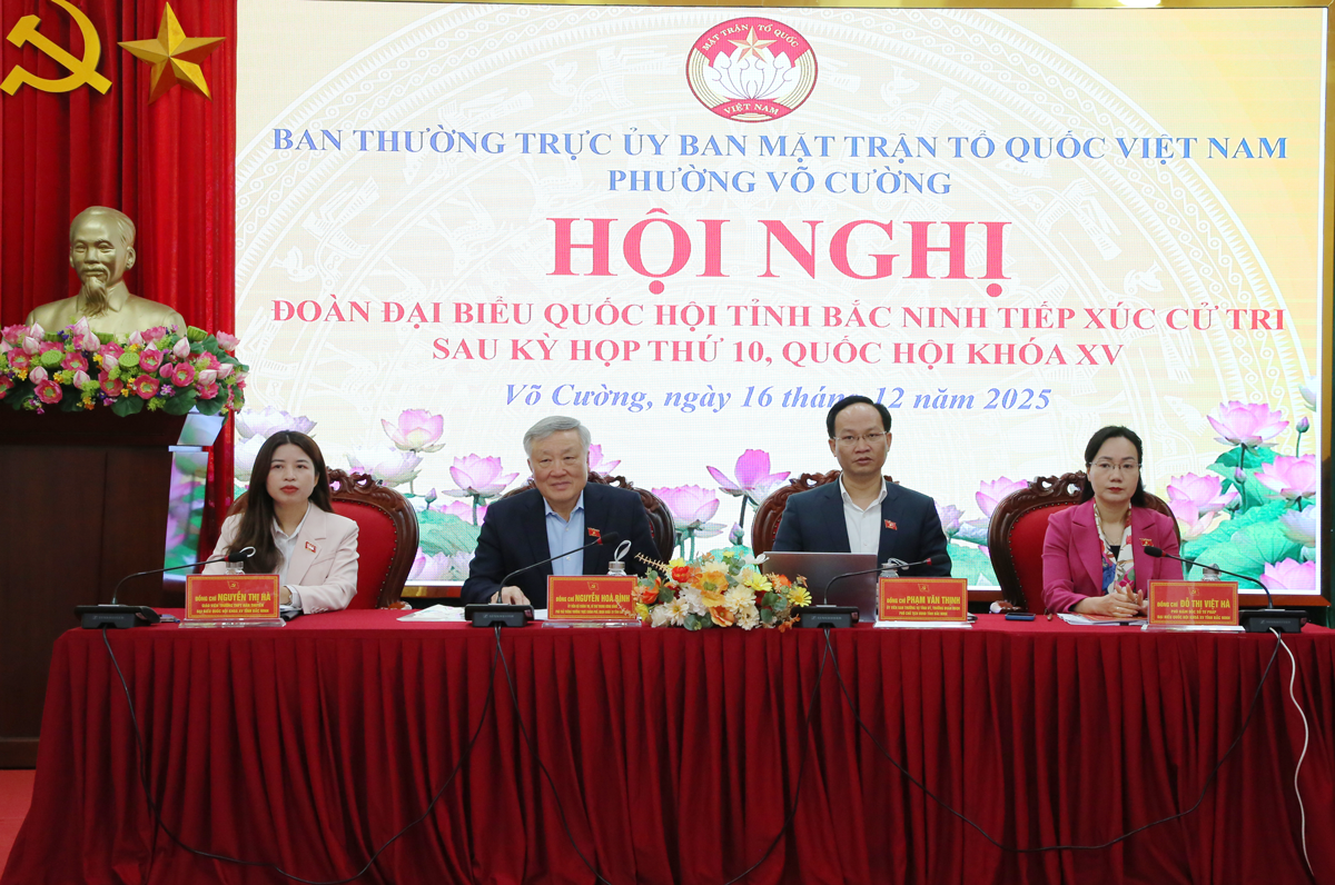 (BNP) - Sáng 16/12, các ông, bà đại biểu Quốc hội khóa XV tỉnh Bắc Ninh gồm: Nguyễn Hòa Bình, Ủy viên Bộ Chính trị, Phó Thủ tướng Thường trực Chính phủ; Phạm Văn Thịnh, Ủy viên Ban Thường vụ Tỉnh ủy, Phó Chủ tịch UBND tỉnh, Trưởng Đoàn Đại biểu Quốc hội tỉnh; Đỗ Thị Việt Hà, Phó Giám đốc Sở Tư pháp; Nguyễn Thị Hà, Giáo viên Trường THPT Hàn Thuyên về tiếp xúc cử tri phường Võ Cường sau Kỳ họp thứ 10, Quốc hội khóa XV.