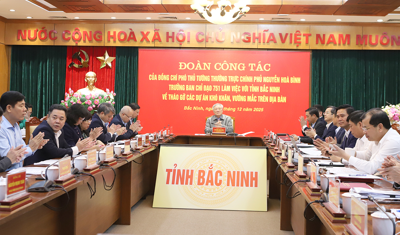 (BNP) - Chiều 24/12, Phó Thủ tướng Thường trực Chính phủ Nguyễn Hoà Bình, Trưởng Ban chỉ đạo về giải quyết các vấn đề khó khăn, vướng mắc các dự án tồn đọng (Ban chỉ đạo 751) cùng Đoàn công tác của Trung ương đã có buổi làm việc với tỉnh Bắc Ninh về giải quyết khó khăn, vướng mắc các dự án tồn đọng. Tham dự có đại diện lãnh đạo các Bộ, ngành, cơ quan, đơn vị Trung ương.