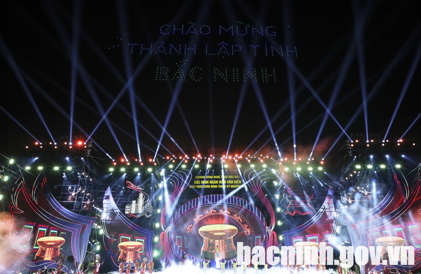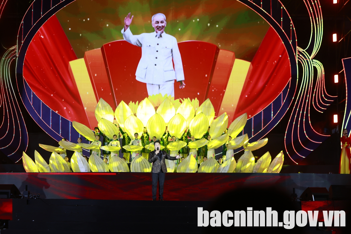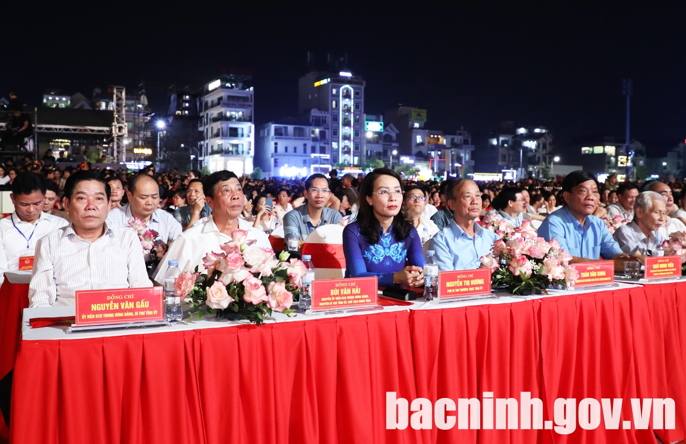 Tiếp đó, Chương trình nghệ thuật với chủ đề “Bắc Ninh ngàn năm văn hiến - khát vọng vươn mình trong kỷ nguyên mới” kéo dài 120 phút, gồm 3 chương: Dòng chảy lịch sử - Ngàn năm văn hiến; Từ làng nghề truyền thống đến thủ phủ công nghiệp phía Bắc; Miền khát vọng tỏa sáng với sự tham gia của các nghệ sĩ nổi tiếng như: NSND Quốc Hưng, NSND Thúy Hường, các ca sĩ: Trọng Tấn, Hòa Minzy, Dương Hoàng Yến… cùng nhiều tiết mục quan họ đặc sắc, múa nghệ thuật hoành tráng.