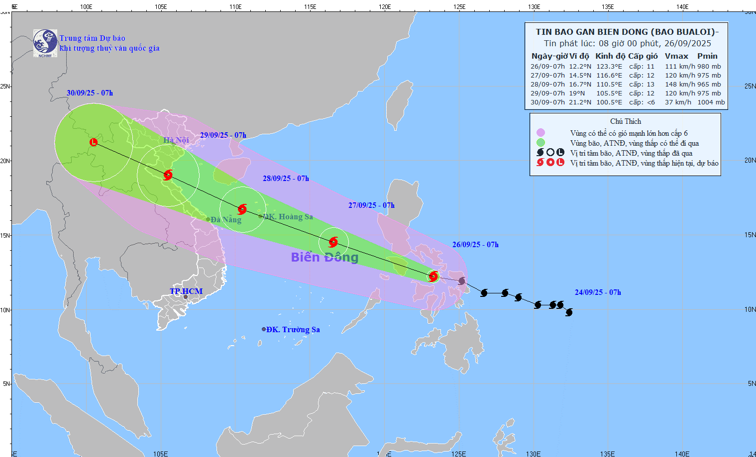 Bản đồ dự báo quỹ đạo và cường độ bão BUALOI phát lúc 08h00 ngày 26/9/2025