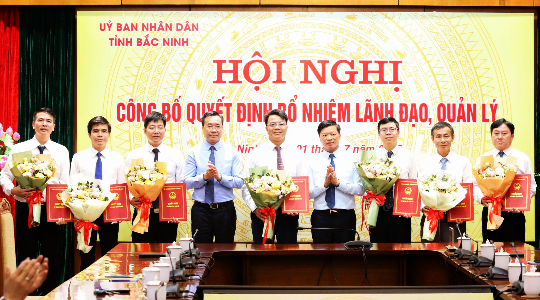 Ngay sau khi thành lập ngày 01/7, Văn phòng UBND tỉnh Bắc Ninh đã sớm kiện toàn chức danh lãnh đạo các phòng, ban chuyên môn, đơn vị sự nghiệp trực thuộc (Ảnh: Phó Chủ tịch UBND tỉnh Đào Quang Khải, thứ 5 từ phải qua và Chánh Văn phòng UBND tỉnh Vũ Huy Phương, thứ 4 từ trái qua trao Quyết định, tặng hoa chúc mừng các đồng chí Phó Chánh Văn phòng UBND tỉnh).