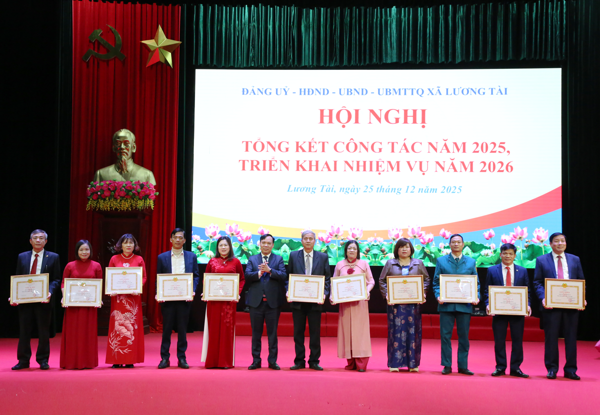 Nhân dịp này, Ban Thường vụ Đảng ủy xã Lương Tài tặng Giấy khen cho 11 tổ chức Đảng trực thuộc hoàn thành xuất sắc nhiệm vụ năm 2025 và 12 đảng viên hoàn thành xuất sắc nhiệm vụ 5 năm liên tục (2021 - 2025). Nhiều tập thể, cá nhân được Chủ tịch UBND xã khen thưởng./.