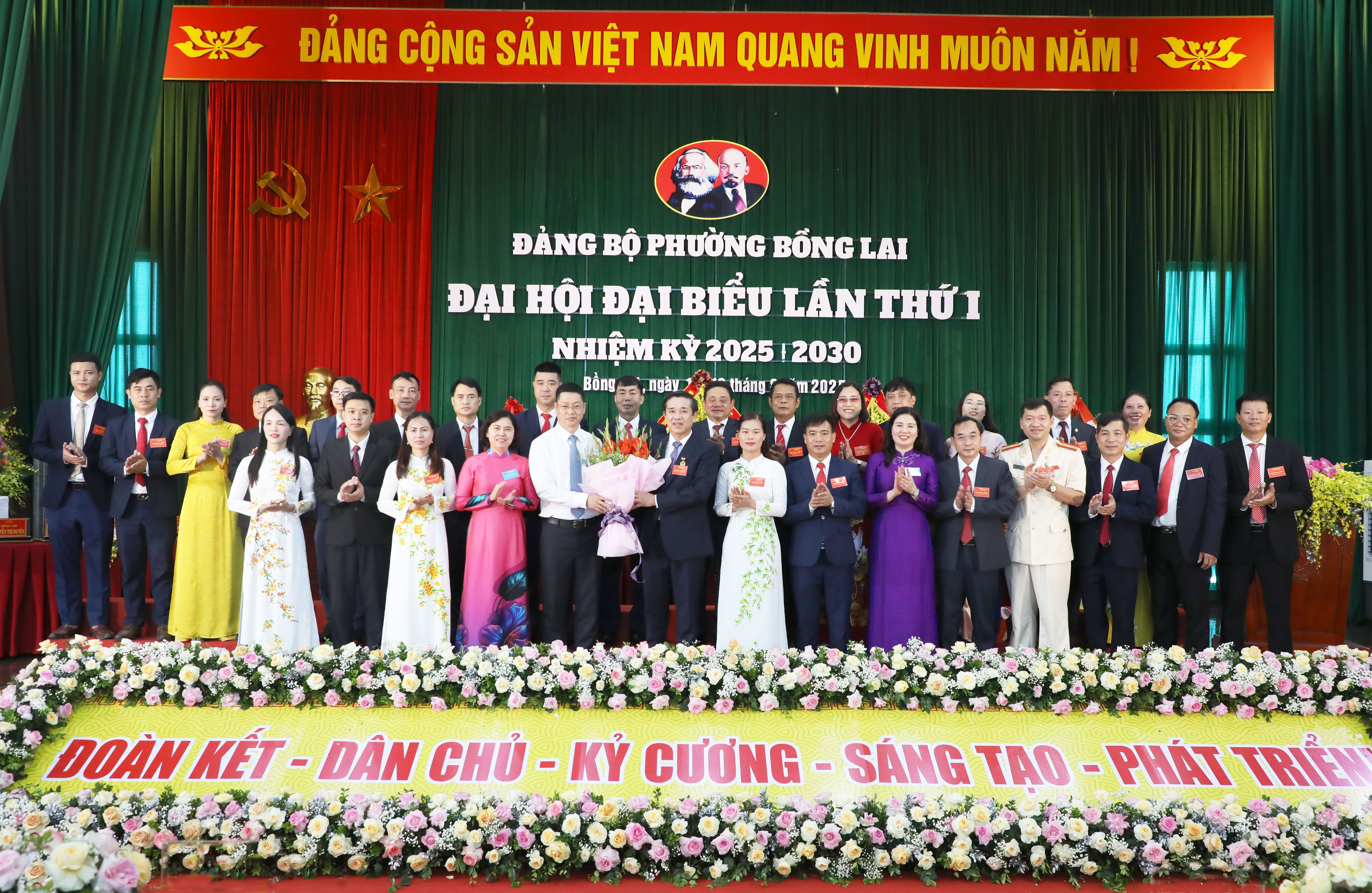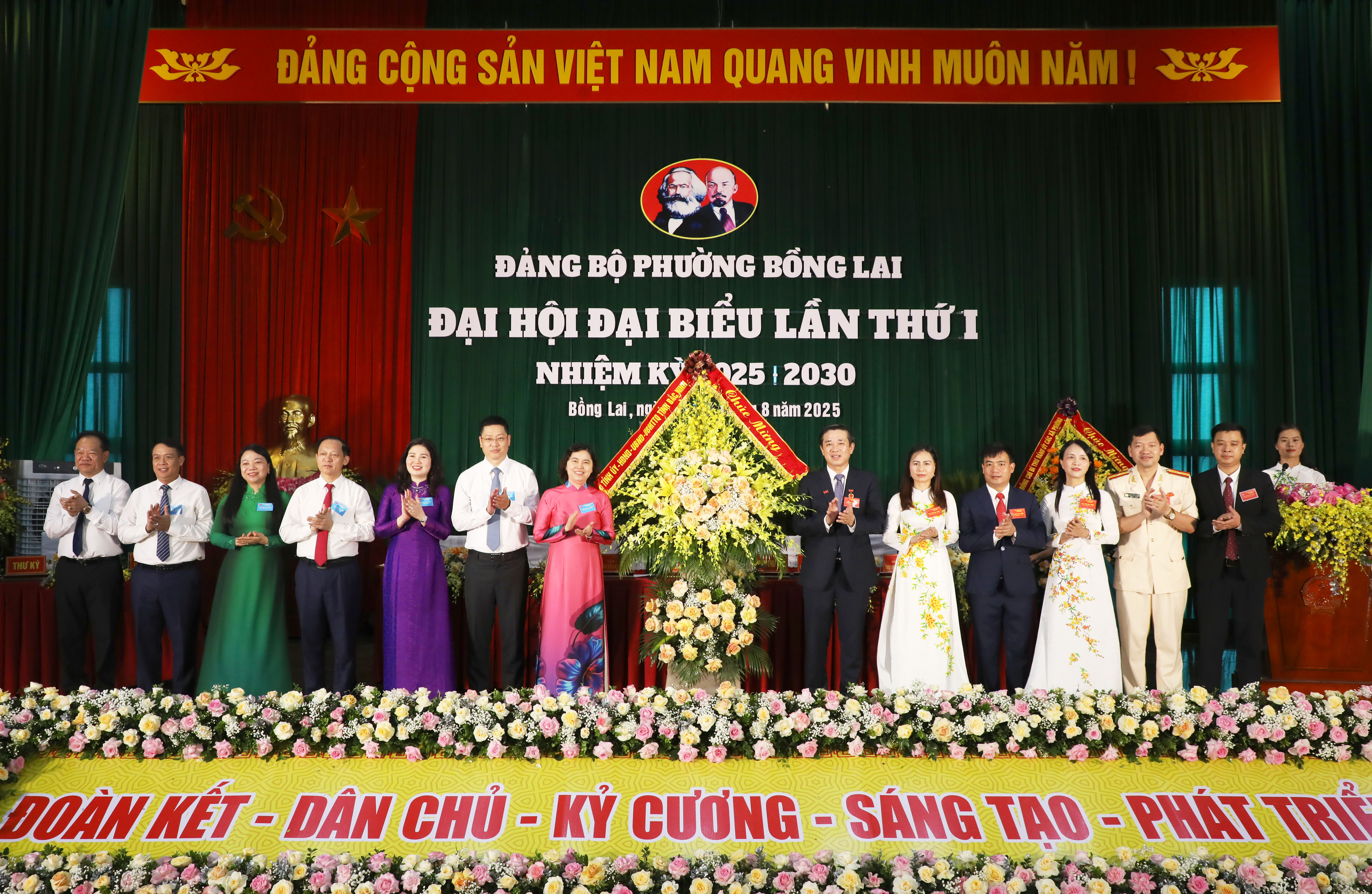 Các đồng chí lãnh đạo tỉnh tặng hoa chúc mừng Ban Chấp hành Đảng bộ phường Bồng Lai nhiệm kỳ 2025 - 2030.