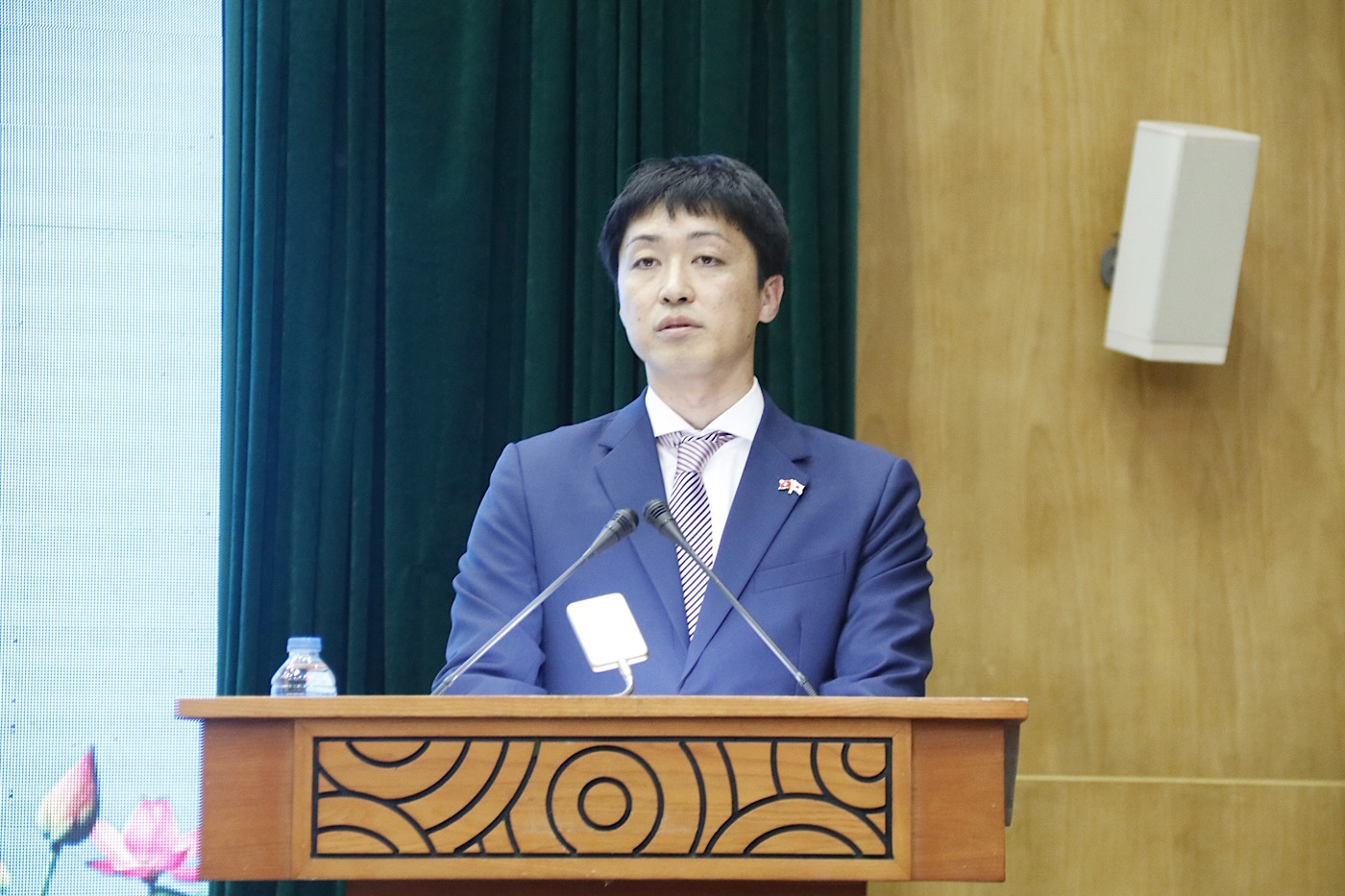 日本贸易振兴机构(JETRO)河内办事处研究部主任 Hagiwara Ryotaro先生在座谈会上作分享发言。