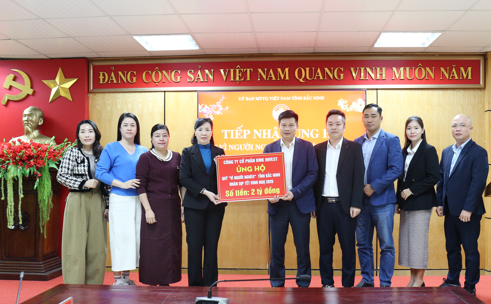 (BNP) - On the morning of February 5th, the Provincial Fatherland Front organized a ceremony to receive donations for the ‘Tet for the poor” in the Spring of the Year of the Horse 2026 from BMK Invest Joint Stock Company (Hanoi).