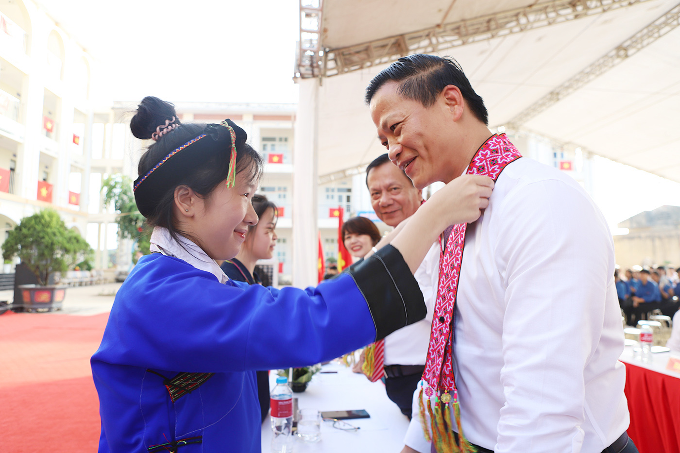Student presents scarves of ethnic groups to Chairman of the Provincial People's Committee Vuong Quoc Tuan.