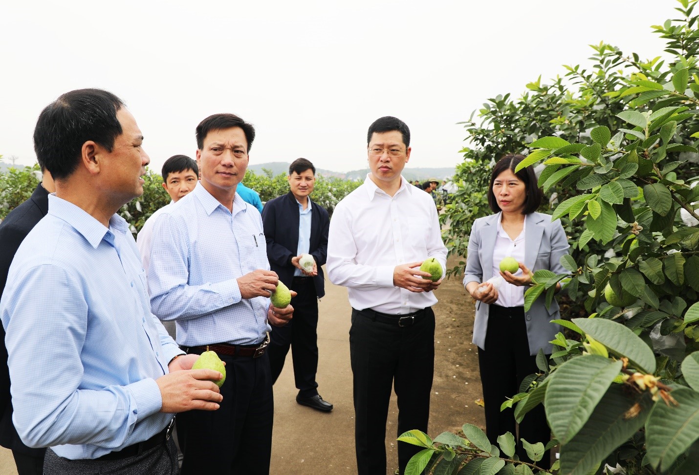 Deputy Secretary of the Provincial Party Committee Tran Huy Phuong (second from the right) visits a model of specialized guava cultivation in Trung village (Phuc Hoa commune).