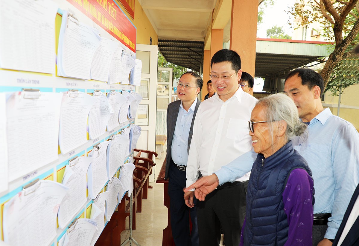Deputy Secretary of the Provincial Party Committee Tran Huy Phuong inspects the voter list posting area at the headquarters of Phuc Hoa Commune People's Committee.