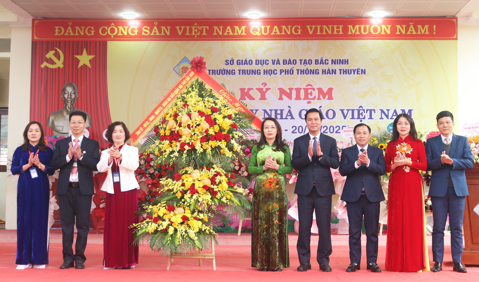 (BNP) - On the morning of November 20, Standing Deputy Secretary of the Provincial Party Committee Nguyen Thi Huong attended and congratulated Han Thuyen High School on the occasion of the 43rd anniversary of Vietnamese Teachers' Day, November 20 (1982 - 2025). Also attending the ceremony were Vice Chairman of the Provincial People's Committee Le Xuan Loi and leaders of a number of provincial departments and branches.