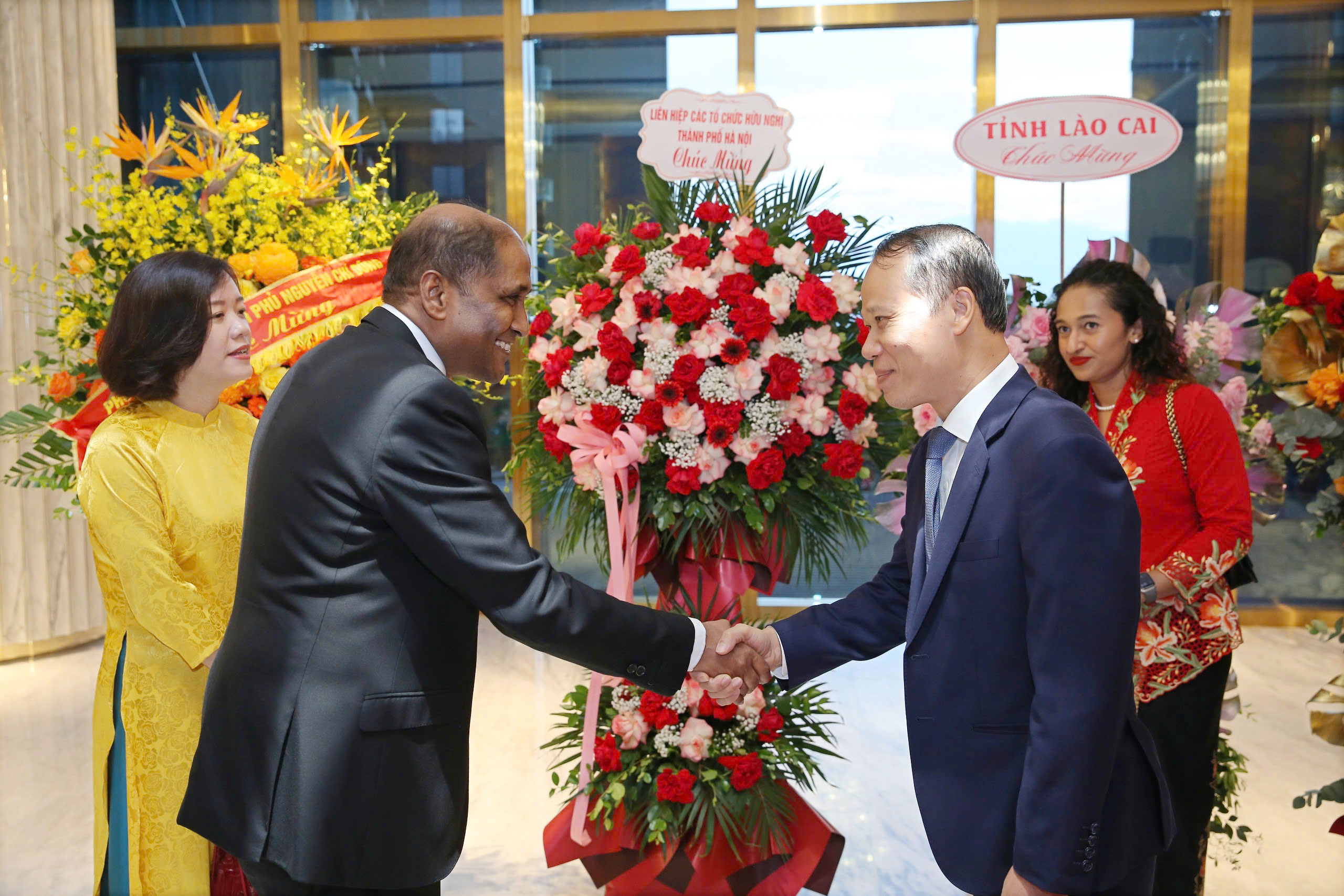 Standing Vice Chairman of the Provincial People's Committee Mai Son presents flowers to congratulate the Singapore Embassy in Hanoi.