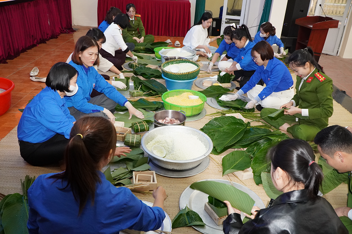 Ngay từ sáng sớm, khu vực tổ chức đã rộn ràng tiếng cười nói, tiếng rửa lá, vo gạo, đãi đỗ, chuẩn bị nguyên liệu. Dưới sự hướng dẫn của các đồng chí có kinh nghiệm, các đoàn viên thanh niên đã cùng nhau thực hiện từng công đoạn: lau lá dong, đong gạo nếp, ướp thịt, gói bánh, buộc lạt… Mỗi chiếc bánh chưng được hoàn thành là sự kết tinh của tinh thần đoàn kết, trách nhiệm và tình cảm sẻ chia của tuổi trẻ phường Ninh Xá.