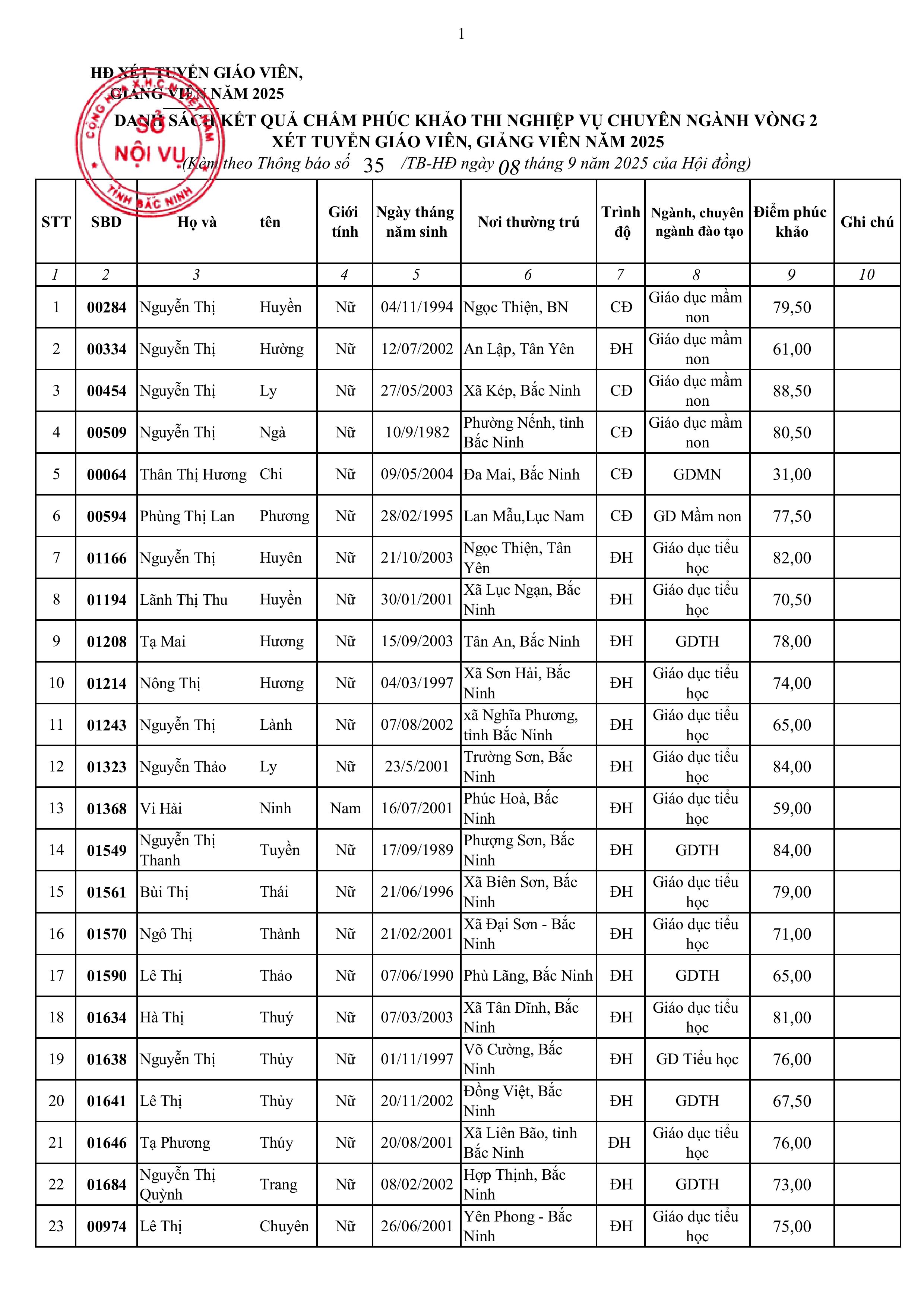 Thông báo kết quả chấm phúc khảo thi nghiệp vụ chuyên ngành vòng 2 xét tuyển giáo viên, giảng viên năm 2025