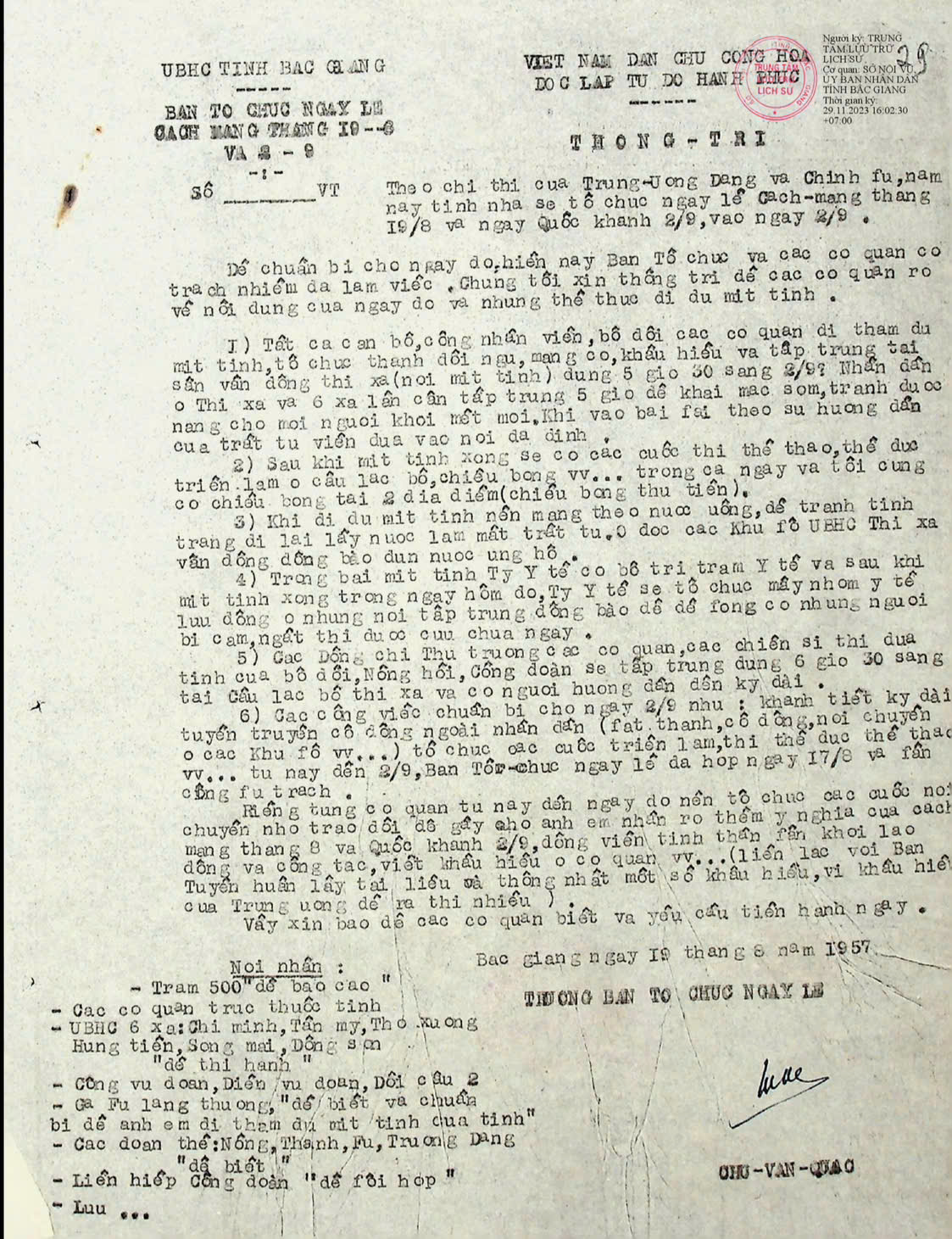 (Thông tri theo chỉ thị của Trung ương Đảng và Chính phủ năm nay tỉnh nhà sẽ tổ chức ngày lễ cách mạng tháng 19/8 và ngày Quốc khánh 2/9, vòa ngày 2/9)