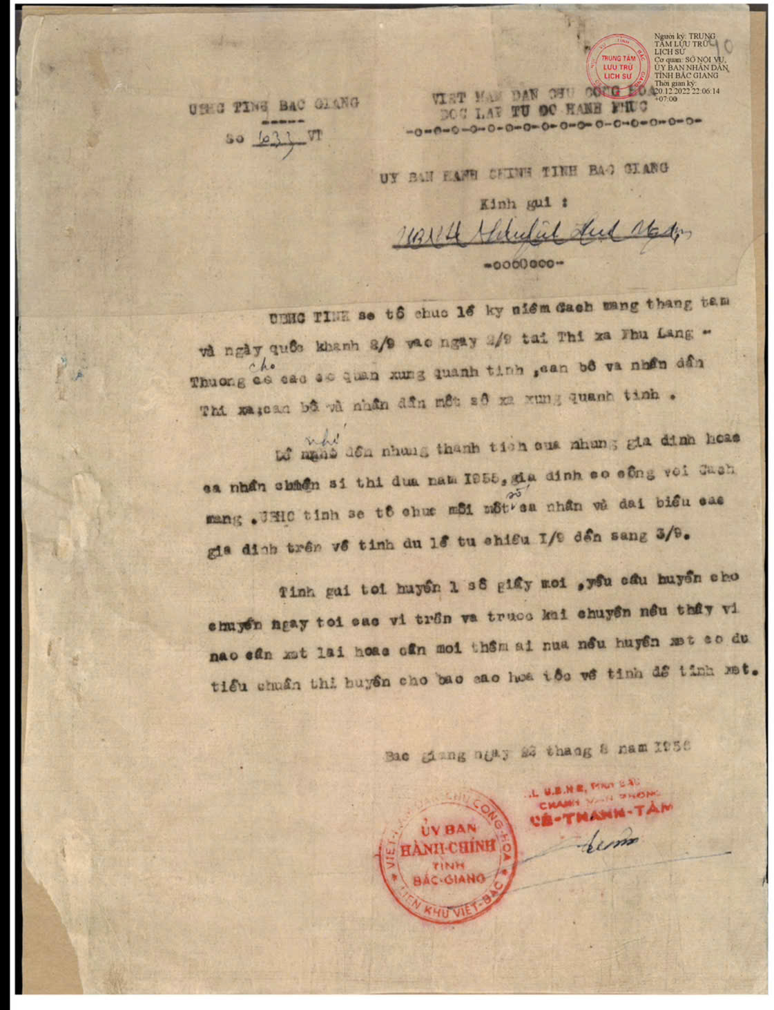 Hướng tới kỷ niệm 80 năm Cách mạng Tháng Tám (19/8/1945 - 19/8/2025) và Quốc khánh 2/9, hoà chung khí thế thi đua sôi nổi cùng toàn thể công chức, viên chức và người lao động ngành Nội vụ, Trung tâm Lưu trữ lịch sử Bắc Ninh số 1 trân trọng giới thiệu đến bạn đọc một số tài liệu quý đang được lưu giữ tại Trung tâm.