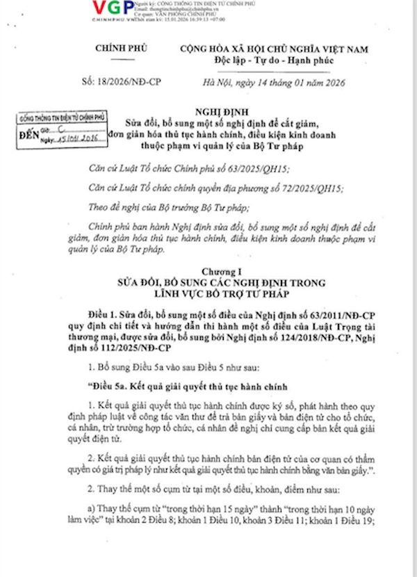 Ngày 14/01/2026, Chính phủ ban hành Nghị định số 18/2026/NĐ-CP sửa đổi, bổ sung một số nghị định nhằm cắt giảm, đơn giản hóa thủ tục hành chính, điều kiện kinh doanh thuộc phạm vi quản lý của Bộ Tư pháp. Tại Chương III, Điều 11, Nghị định số 18/2026/NĐ-CP đã sửa đổi, bổ sung một số quy định của Nghị định số 99/2022/NĐ-CP ngày 30/11/2022 của Chính phủ về đăng ký biện pháp bảo đảm nhằm tiếp tục cải cách mạnh mẽ thủ tục hành chính trong lĩnh vực đăng ký biện pháp bảo đảm, phù hợp với bối cảnh đẩy mạnh chuyển đổi số, xây dựng nền hành chính hiện đại, minh bạch, hiệu quả.