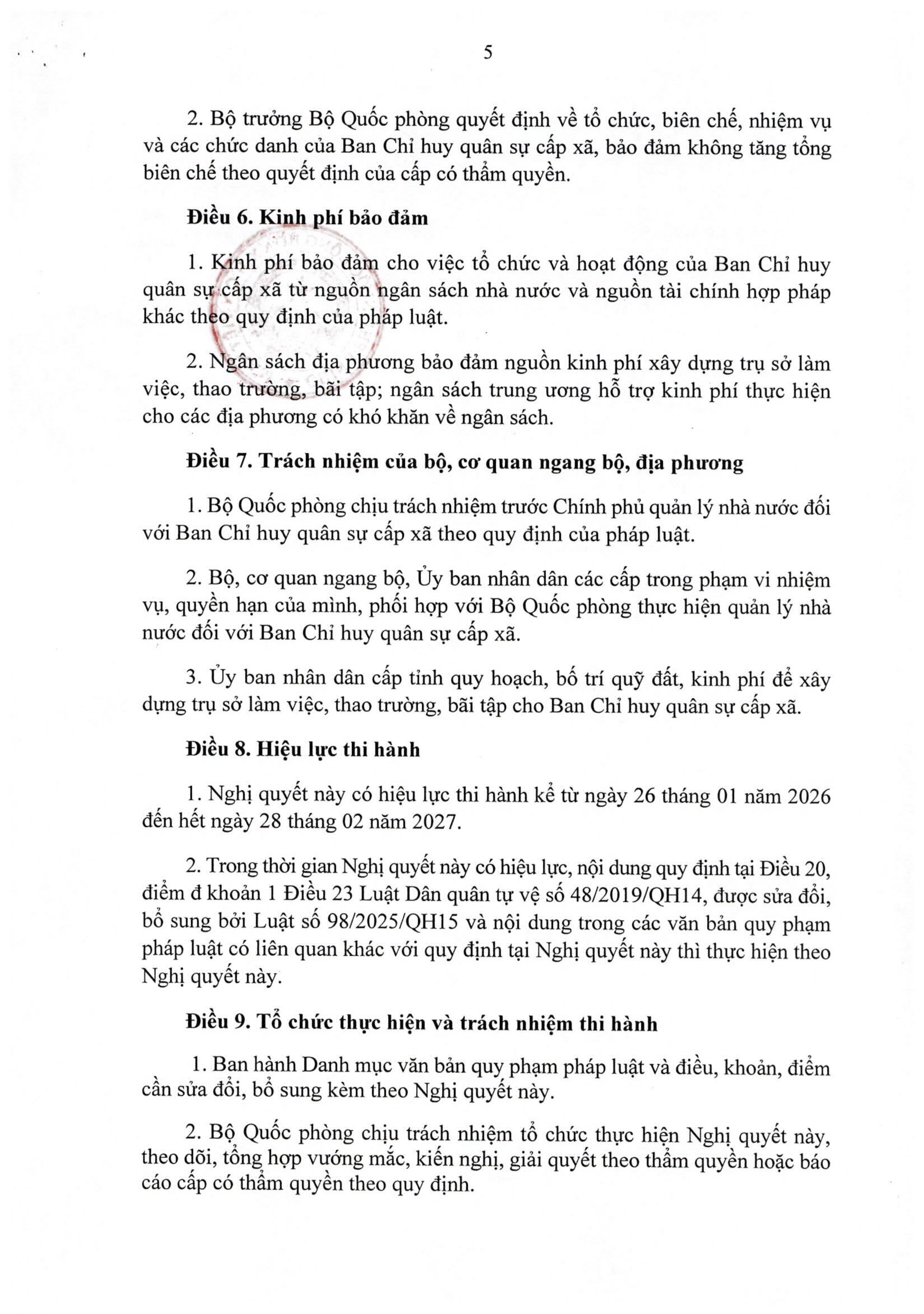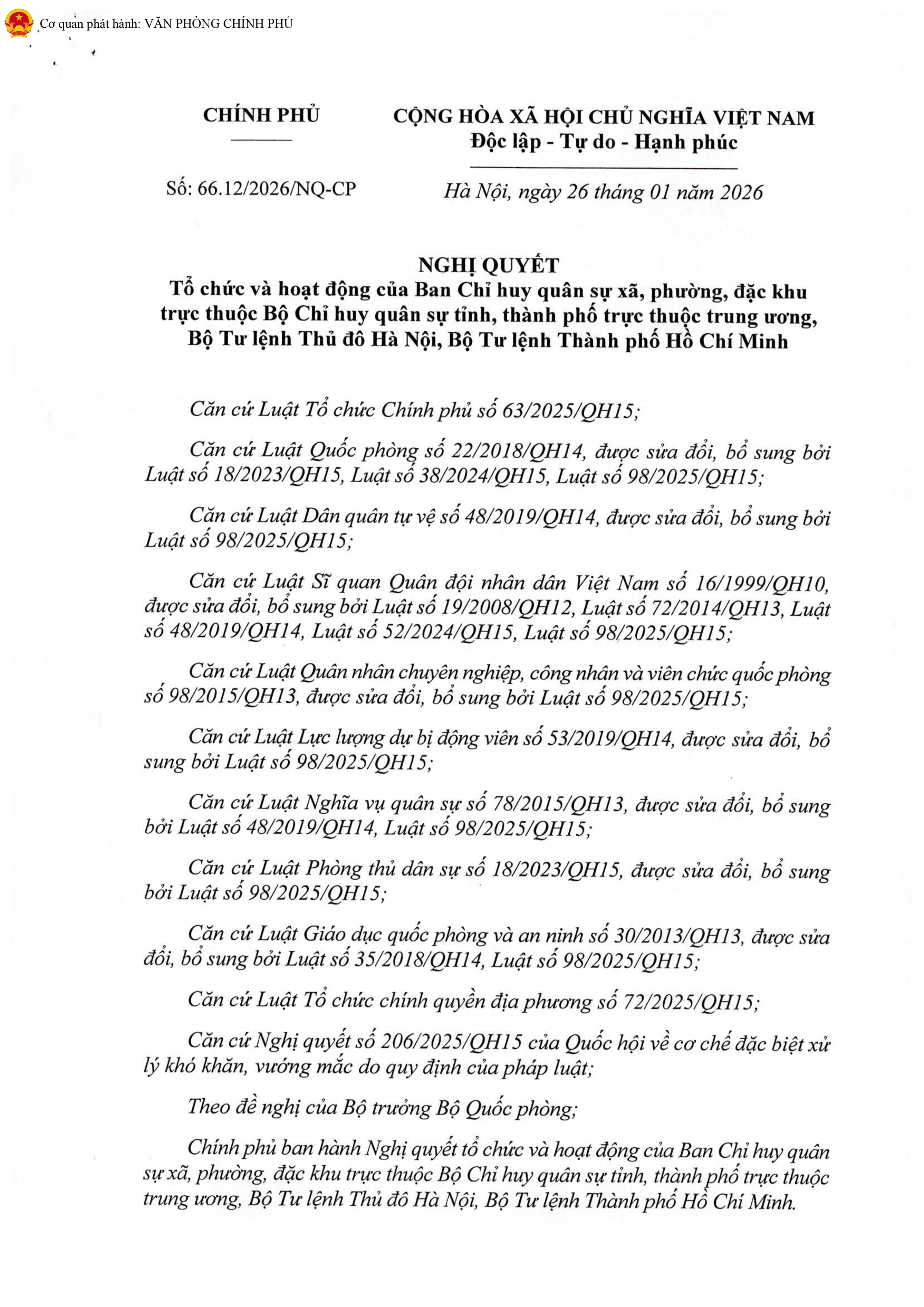 Phó Thủ tướng Chính phủ Phạm Thị Thanh Trà vừa ký quyết định ban hành Nghị quyết số 66.12/2026/NQ-CP ngày 26/1/2026 của Chính phủ về tổ chức và hoạt động của Ban Chỉ huy quân sự xã, phường, đặc khu trực thuộc Bộ Chỉ huy quân sự tỉnh, thành phố trực thuộc trung ương, Bộ Tư lệnh Thủ đô Hà Nội, Bộ Tư lệnh Thành phố Hồ Chí Minh.