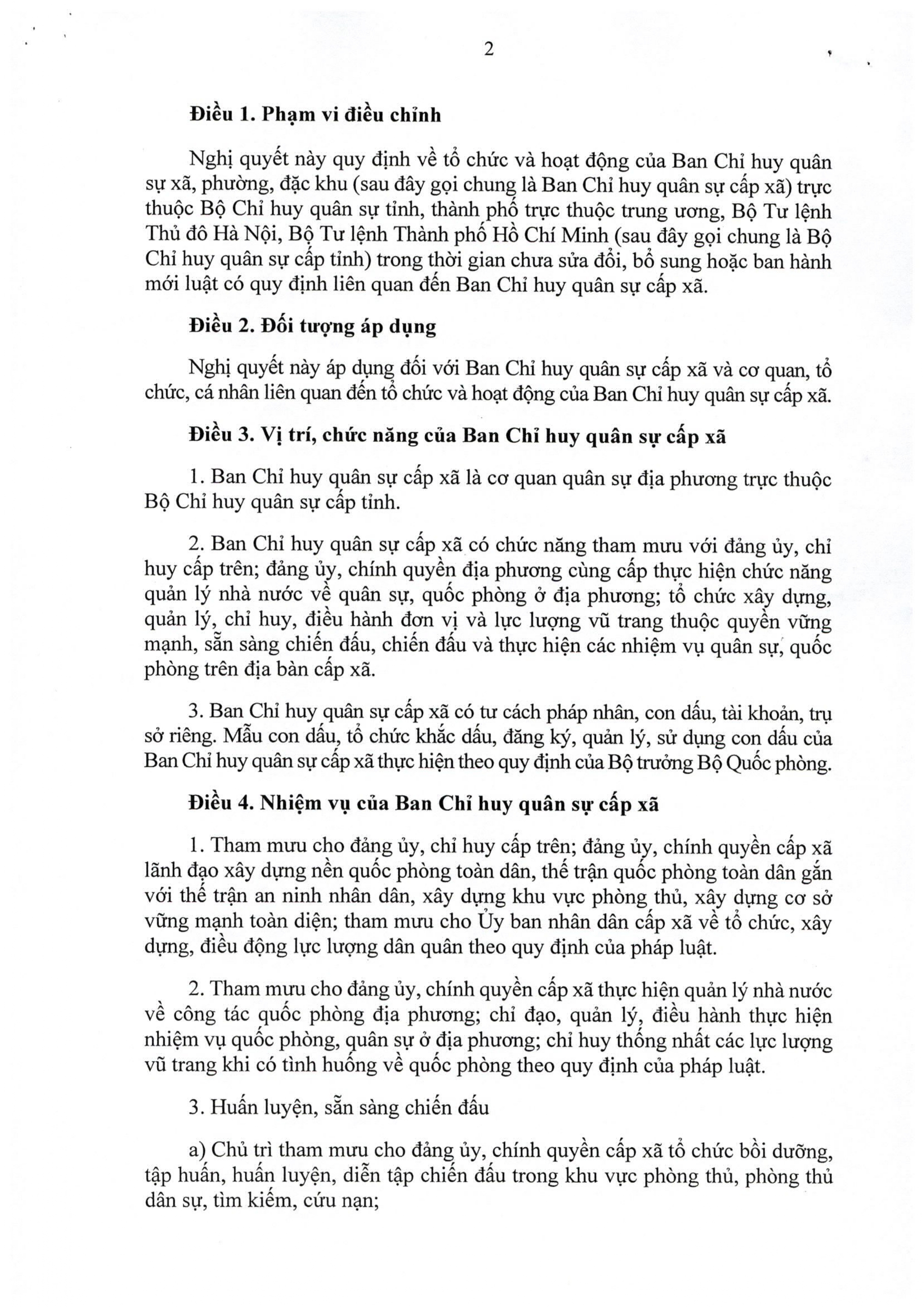 Nghị quyết quy định về tổ chức và hoạt động của Ban Chỉ huy quân sự xã, phường, đặc khu (sau đây gọi chung là Ban Chỉ huy quân sự cấp xã) trực thuộc Bộ Chỉ huy quân sự tỉnh, thành phố trực thuộc trung ương, Bộ Tư lệnh Thủ đô Hà Nội, Bộ Tư lệnh Thành phố Hồ Chí Minh (sau đây gọi chung là Bộ Chỉ huy quân sự cấp tỉnh) trong thời gian chưa sửa đổi, bổ sung hoặc ban hành mới luật có quy định liên quan đến Ban Chỉ huy quân sự cấp xã.