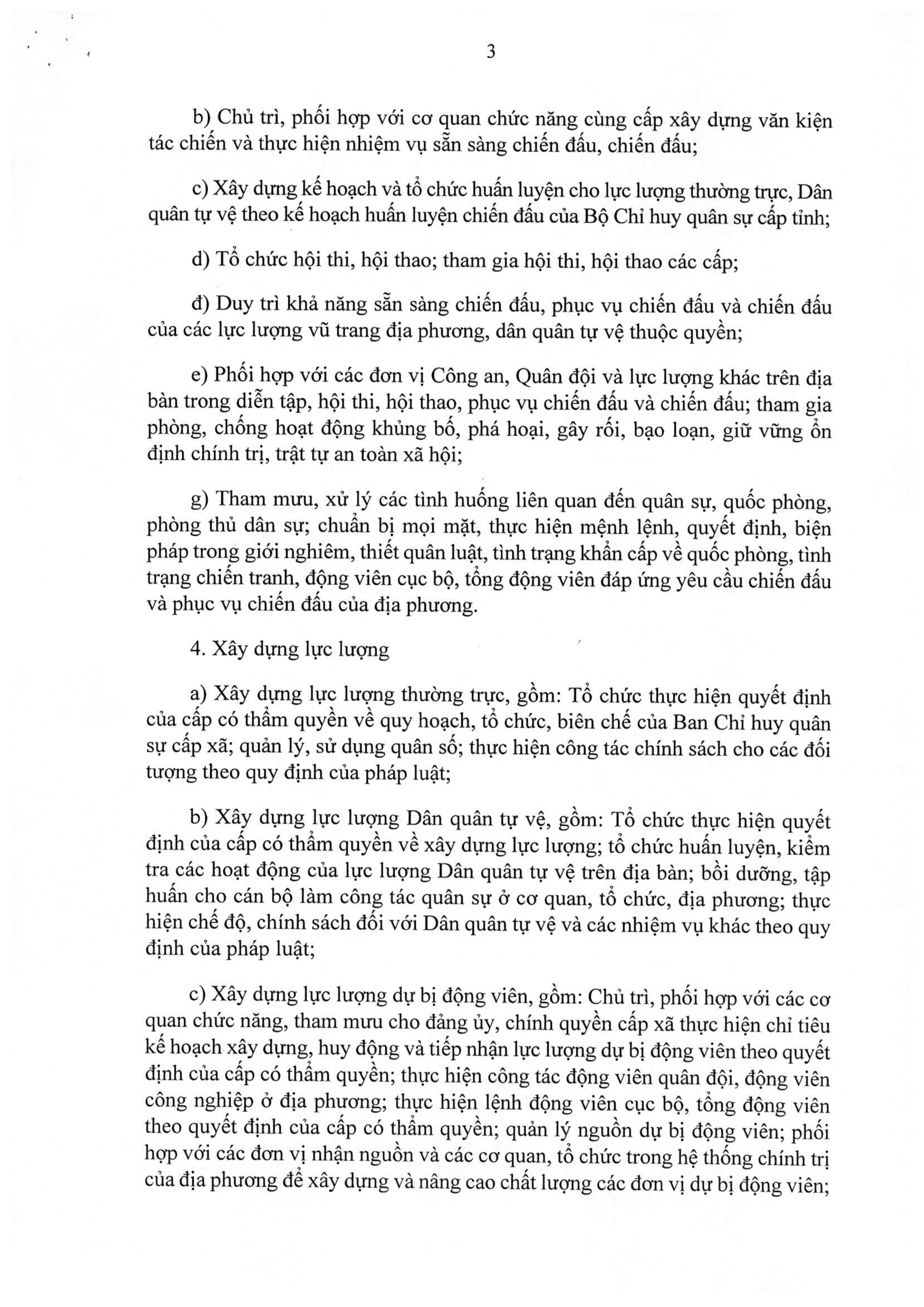 2. Ban Chỉ huy quân sự cấp xã có chức năng tham mưu với đảng ủy, chỉ huy cấp trên; đảng ủy, chính quyền địa phương cùng cấp thực hiện chức năng quản lý nhà nước về quân sự, quốc phòng ở địa phương; tổ chức xây dựng, quản lý, chỉ huy, điều hành đơn vị và lực lượng vũ trang thuộc quyền vững mạnh, sẵn sàng chiến đấu, chiến đấu và thực hiện các nhiệm vụ quân sự, quốc phòng trên địa bàn cấp xã.