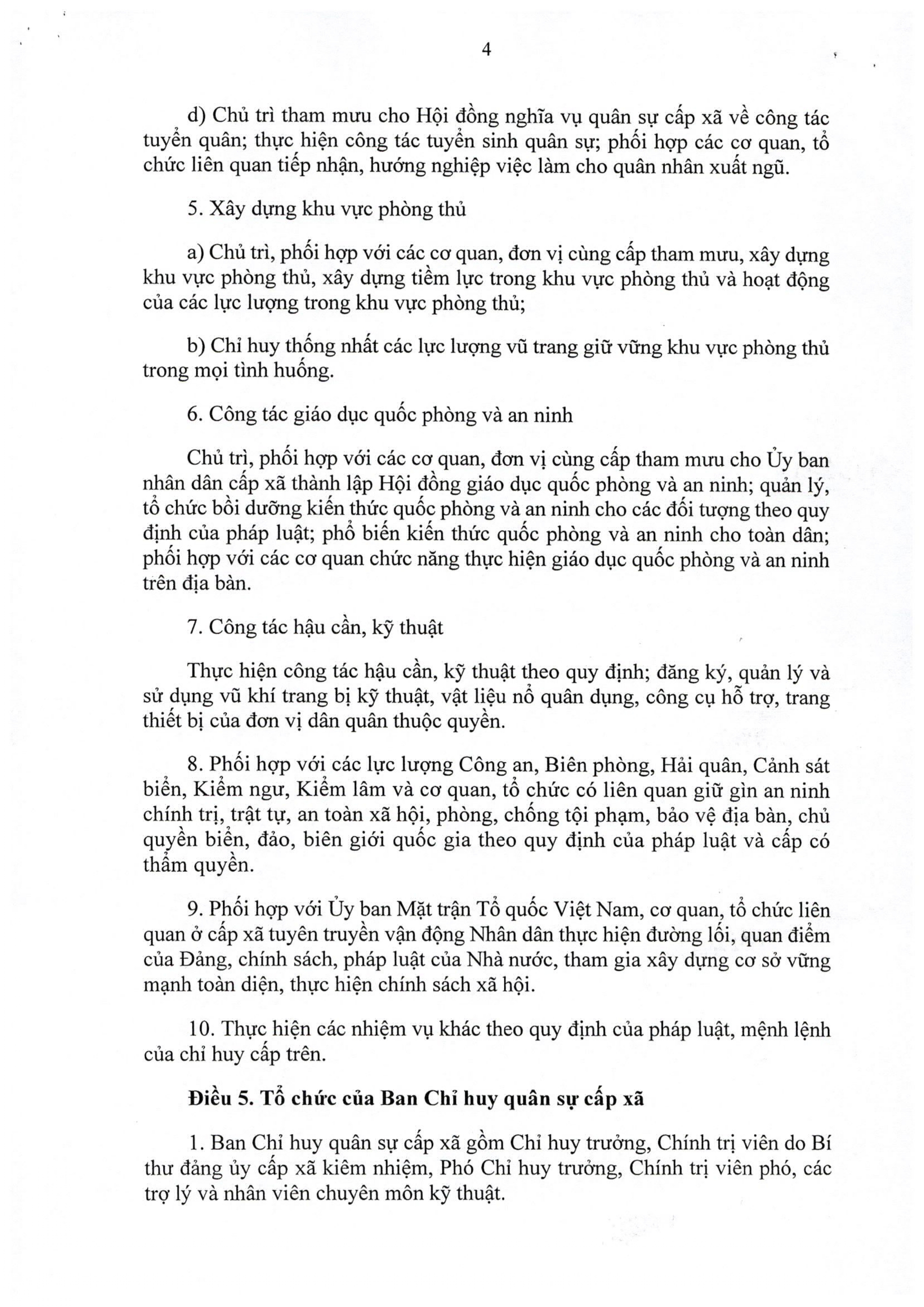 1. Ban Chỉ huy quân sự cấp xã gồm Chỉ huy trưởng, Chính trị viên do Bí thư đảng ủy cấp xã kiêm nhiệm, Phó Chỉ huy trưởng, Chính trị viên phó, các trợ lý và nhân viên chuyên môn kỹ thuật.