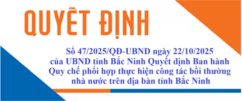 Ngày 22/10/2025, UBND tỉnh Bắc Ninh ban hành Quy chế phối hợp thực hiện công tác bồi thường nhà nước trên địa bàn tỉnh Bắc Ninh kèm theo Quyết định số 47/2025/QĐ-UBND.