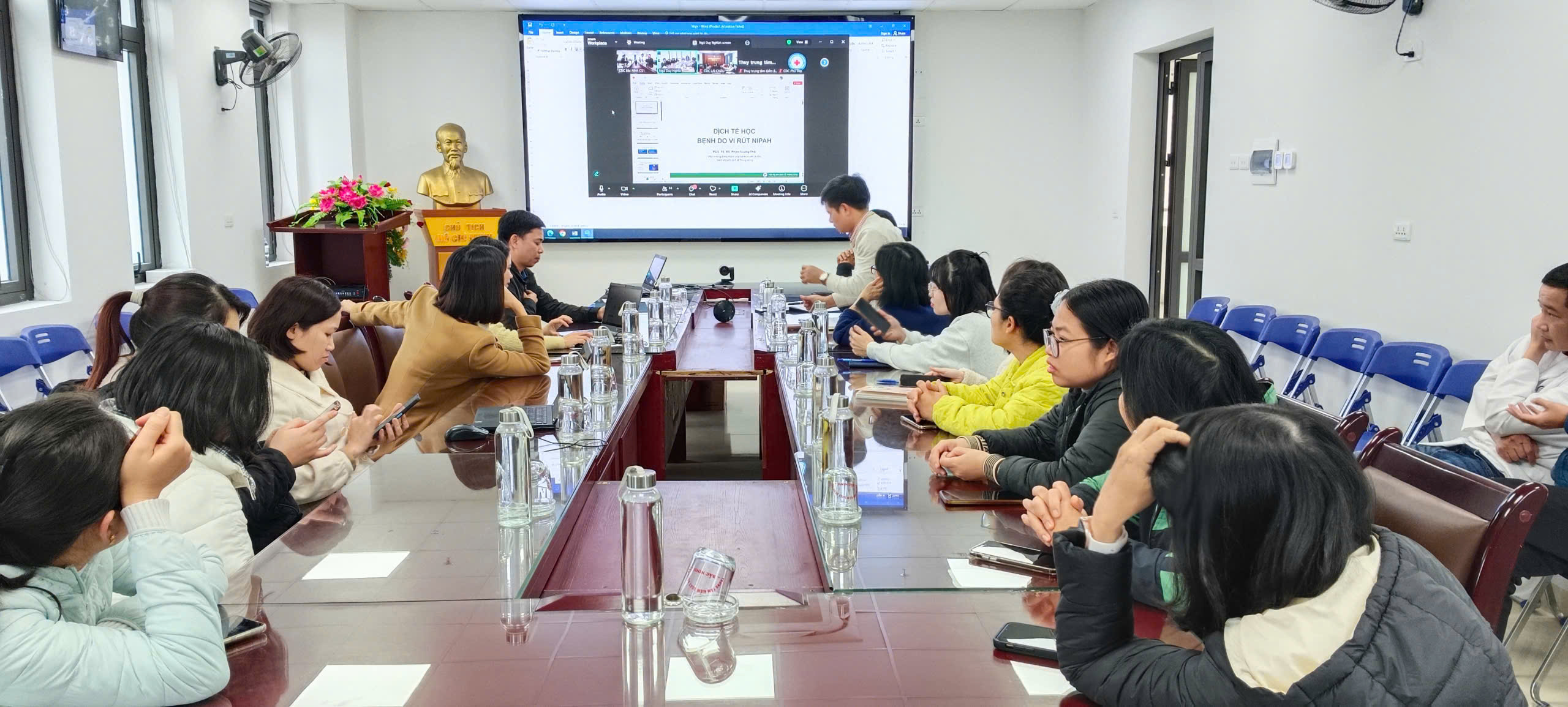 Tại điểm cầu Trung tâm Kiểm soát bệnh tật tỉnh Bắc Ninh có đồng chí Lê Tiến Cương – Phó Giám đốc Trung tâm; đồng chí Đoàn Thị Kim Ưng – Phó Giám đốc Trung tâm Kiểm soát bệnh tật, cùng lãnh đạo và cán bộ các khoa phòng liên quan tại đơn vị.