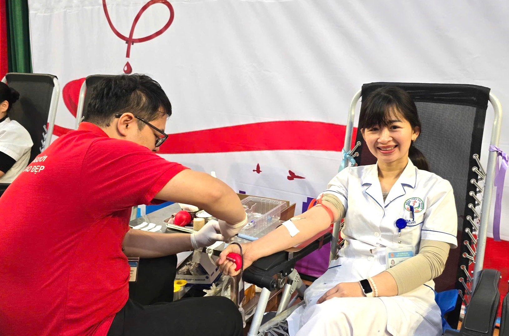 Điều dưỡng viên Phạm Xuân Hiền tươi tắn trao đi những giọt máu hồng như những tình nguyện viên khác với mong muốn giúp những bệnh nhân không may mắn.