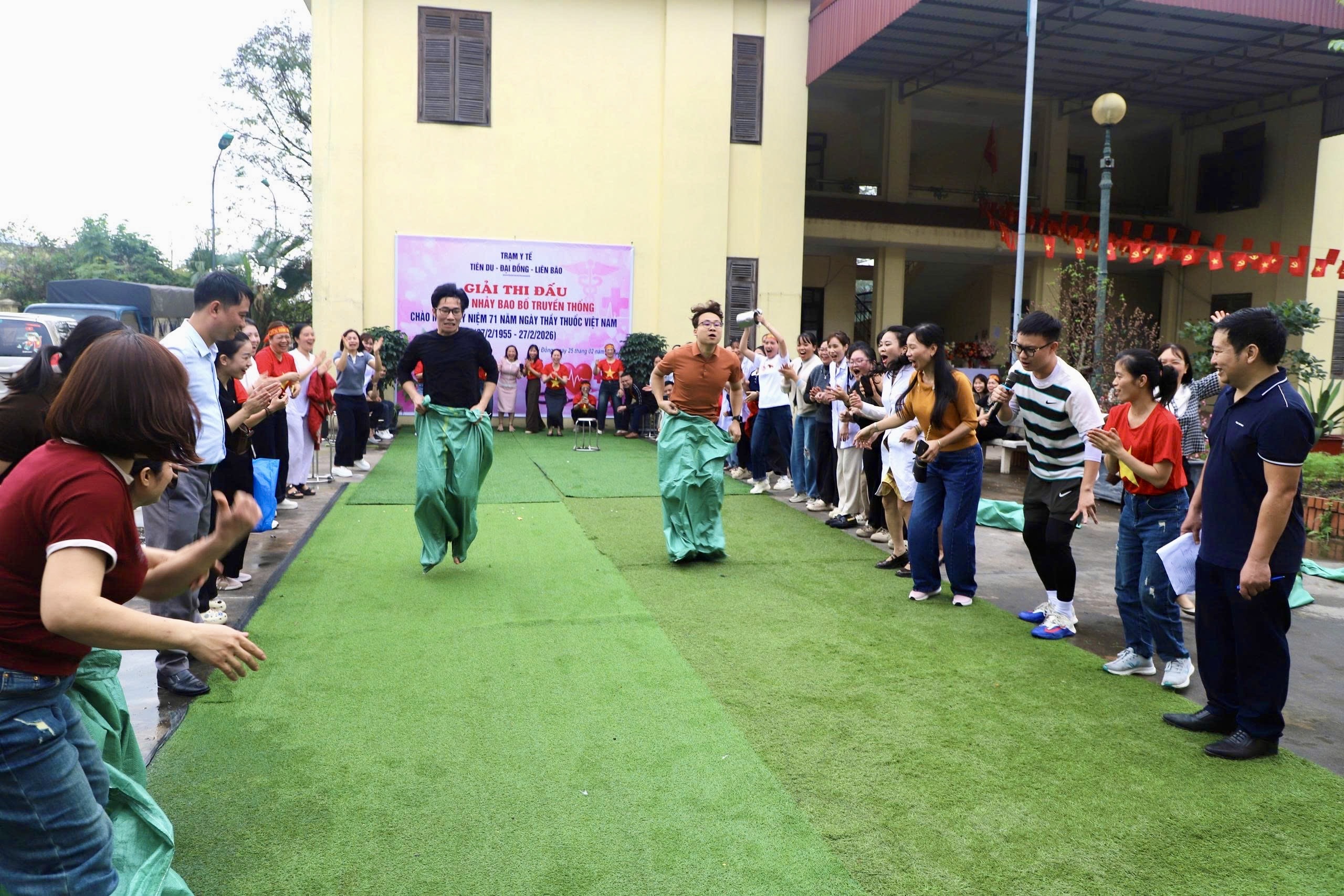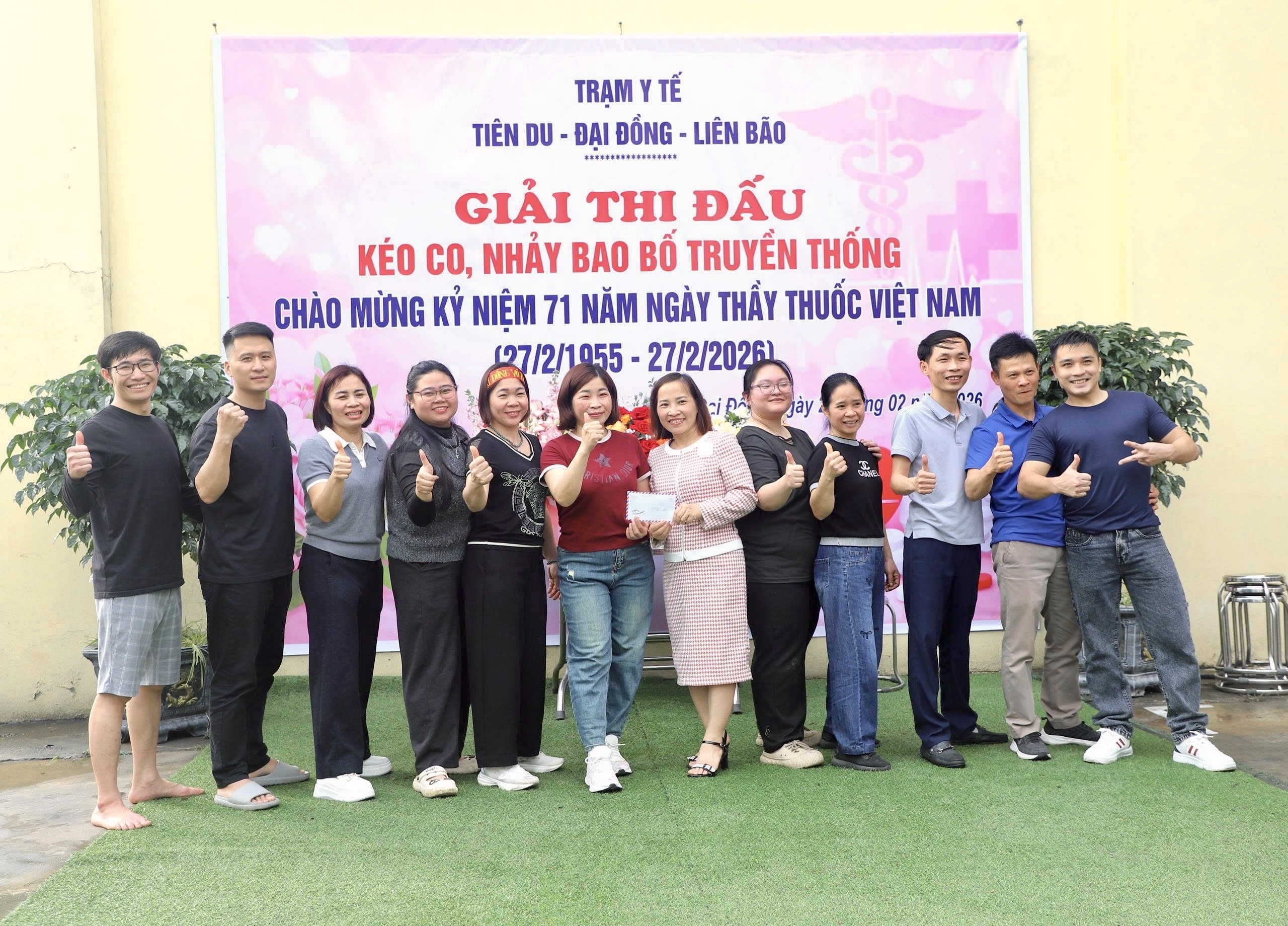 Trong không khí thi đua sôi nổi chào mừng Đại hội Đảng toàn quốc lần thứ XIV và kỷ niệm 71 năm ngày Thầy thuốc Việt Nam (27/02/1955 - 27/02/2026), chiều 25/02/2026, ba đơn vị Trạm Y tế: Đại Đồng, Liên Bão, Tiên Du đã phối hợp tổ chức Giải giao lưu thể thao kéo co và nhảy bao bố đầy ý nghĩa. Hoạt động nhằm tri ân những chiến sĩ áo trắng công tác tại tuyến y tế gần dân nhất, những người gác cổng của ngành Y tế.