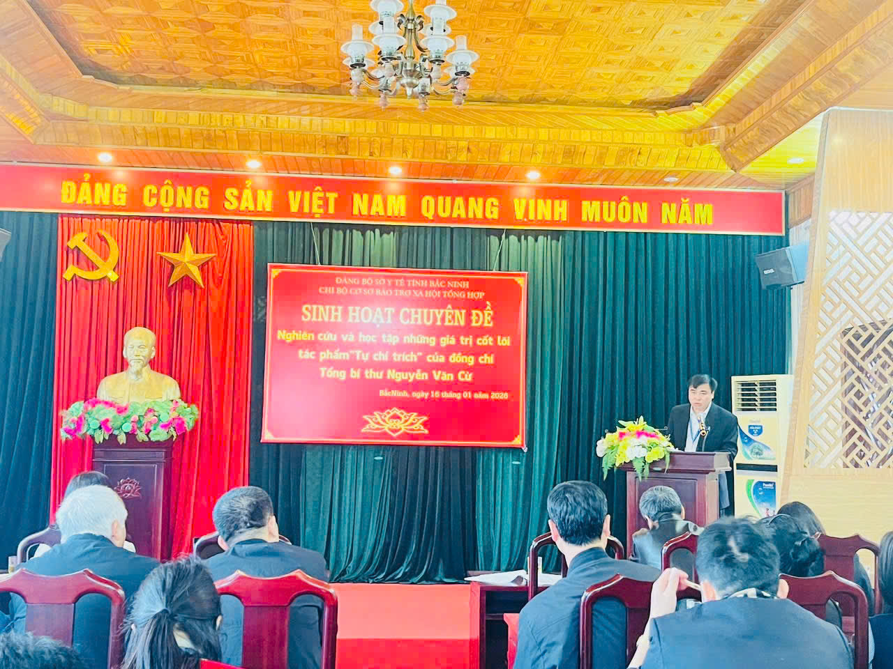 Ngày 16/01/2026, tại Khu Lưu niệm Tổng Bí thư Nguyễn Văn Cừ, phường Phù Khê, tỉnh Bắc Ninh, Chi bộ Cơ sở Bảo trợ xã hội tổng hợp tổ chức sinh hoạt chuyên đề nghiên cứu, học tập giá trị cốt lõi của tác phẩm “Tự chỉ trích” của đồng chí Tổng Bí thư Nguyễn Văn Cừ. Tham dự Hội nghị có Ban Chi uỷ Chi bộ và toàn thể đảng viên Chi bộ Cơ sở.