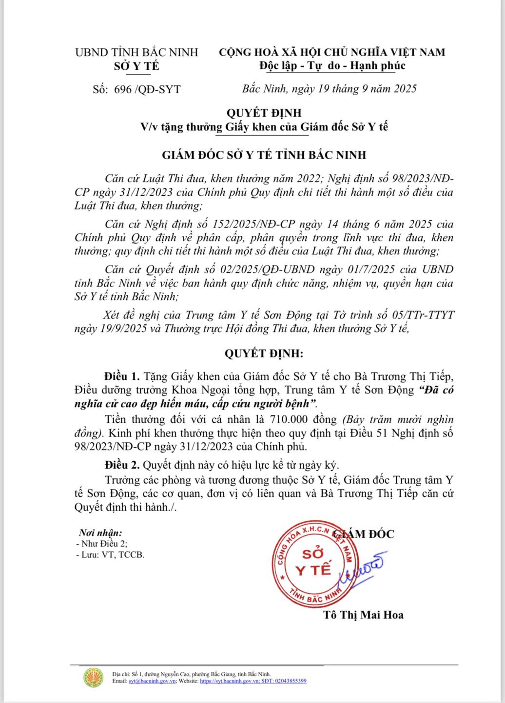 Sở Y tế vừa trao giấy khen cho điều dưỡng Trương Thị Tiếp, điều dưỡng trưởng Khoa Ngoại tổng hợp, Trung tâm Y tế Sơn Động đã tình nguyện hiến máu, kịp thời cứu sống người bệnh.
