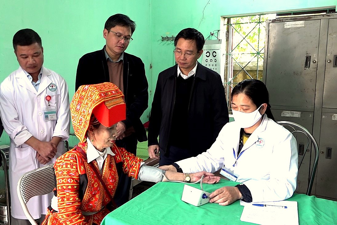 Đồng chí Đào Khắc Hùng, Phó Giám đốc Sở Y tế kiểm tra công tác khám chữa bệnh tại Trạm Y tế xã Tuấn Đạo. Bệnh nhân trong ảnh là bà Đặng Thị Huệ ở thôn Tuấn Sơn.